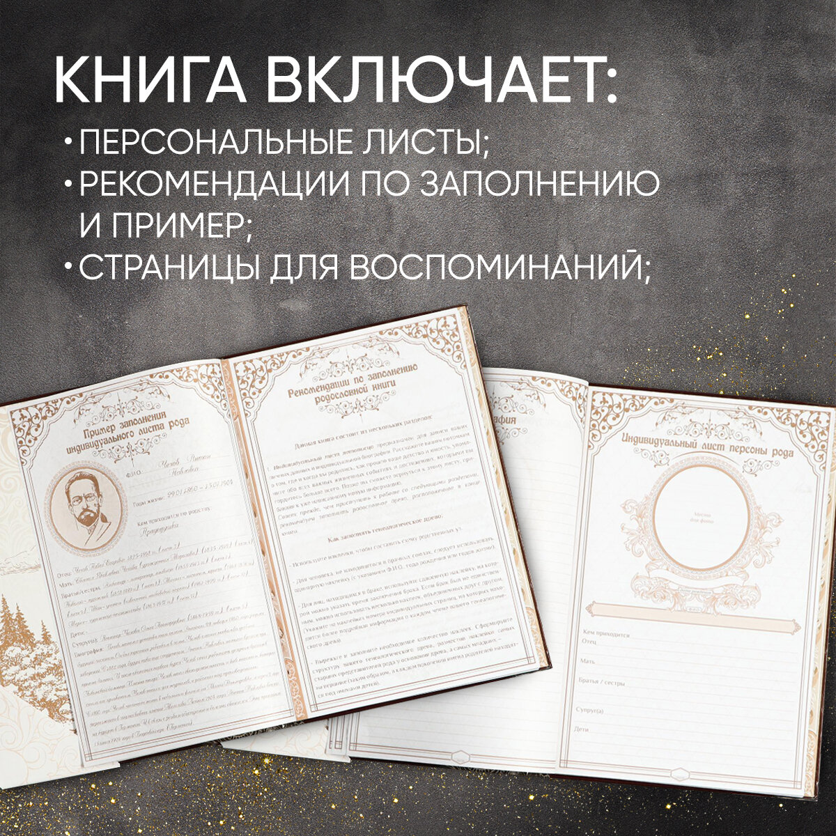 | Дополнительная информация | Внутри книги вы найдёте: персональные листы; рекомендации по заполнению и пример; страницы для воспоминаний; разделы: «Награды и достижения», «Традиции нашего рода»; место для послания потомкам; генеалогическое древо формата А3 и наклейки для него. |