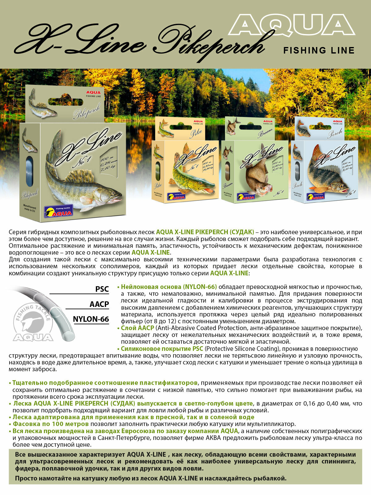 Леска для рыбалки AQUA X-Line Pikeperch (Судак) 100m 0.18mm 3.5kg цвет - светло-голубой информация: