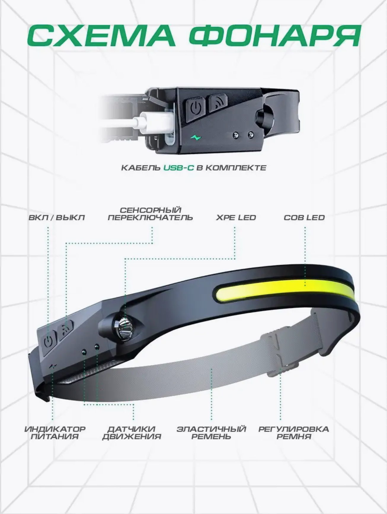 Фонарик налобный аккумуляторный светодиодный (гибкая COB панель + боковой светодиод, датчик движения, водонепроницаемый, зарядка USB)