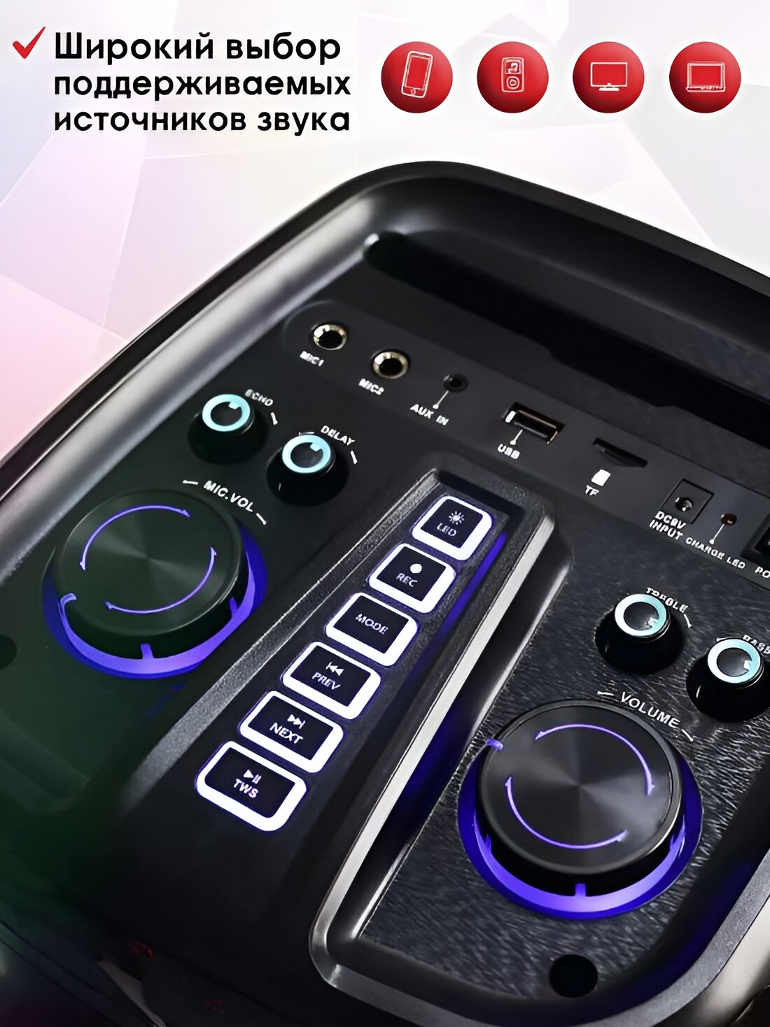| Особенности | FM-радио / дисплей / караоке / поддержка microSD / ручка / световые эффекты |