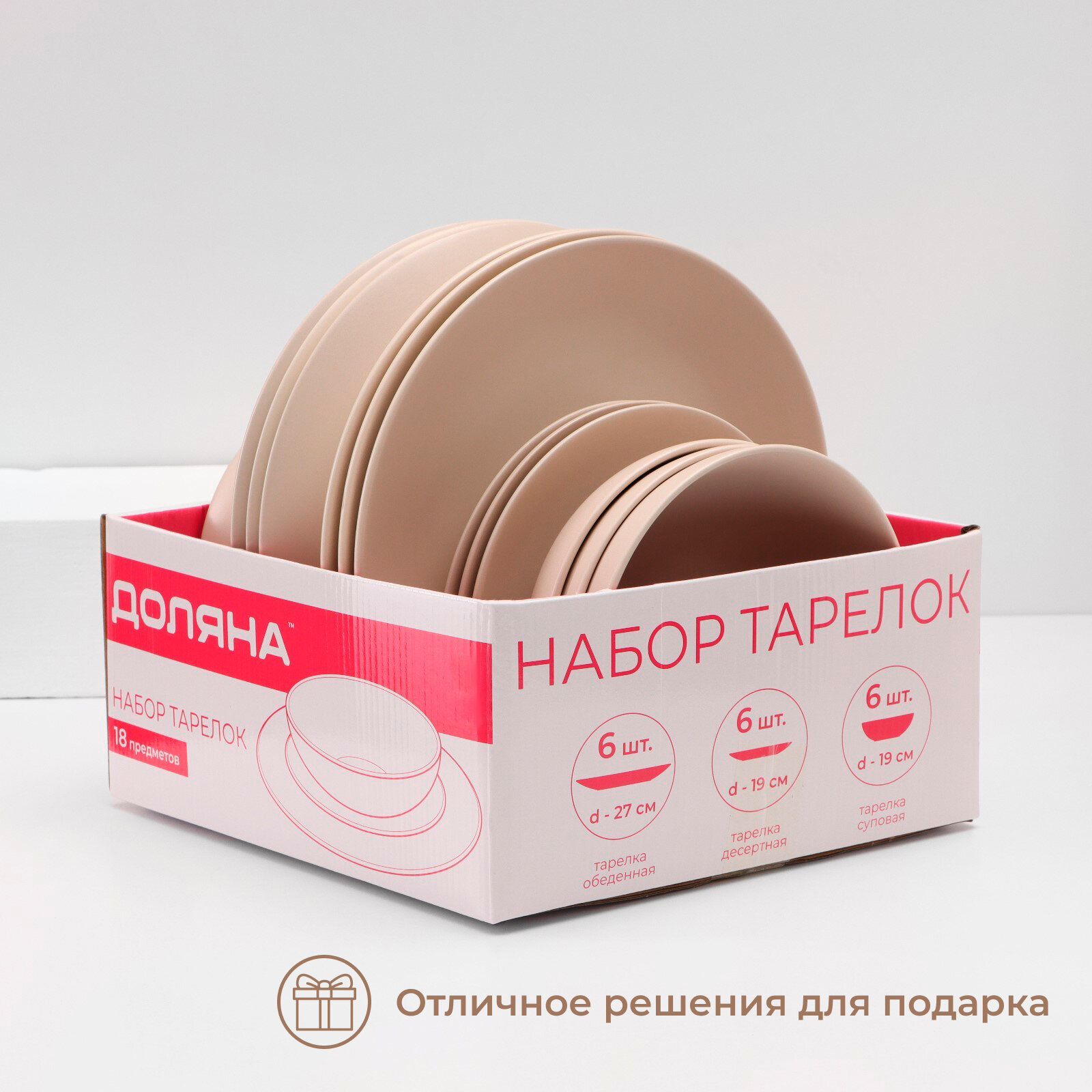 Доляна Набор тарелок керамических Доляна «Пастель», 18 предметов: 6 тарелок d=19 см, 6 тарелок d=27 см, 6 мисок d=19 см, цвет коричневый 10 515 ₽