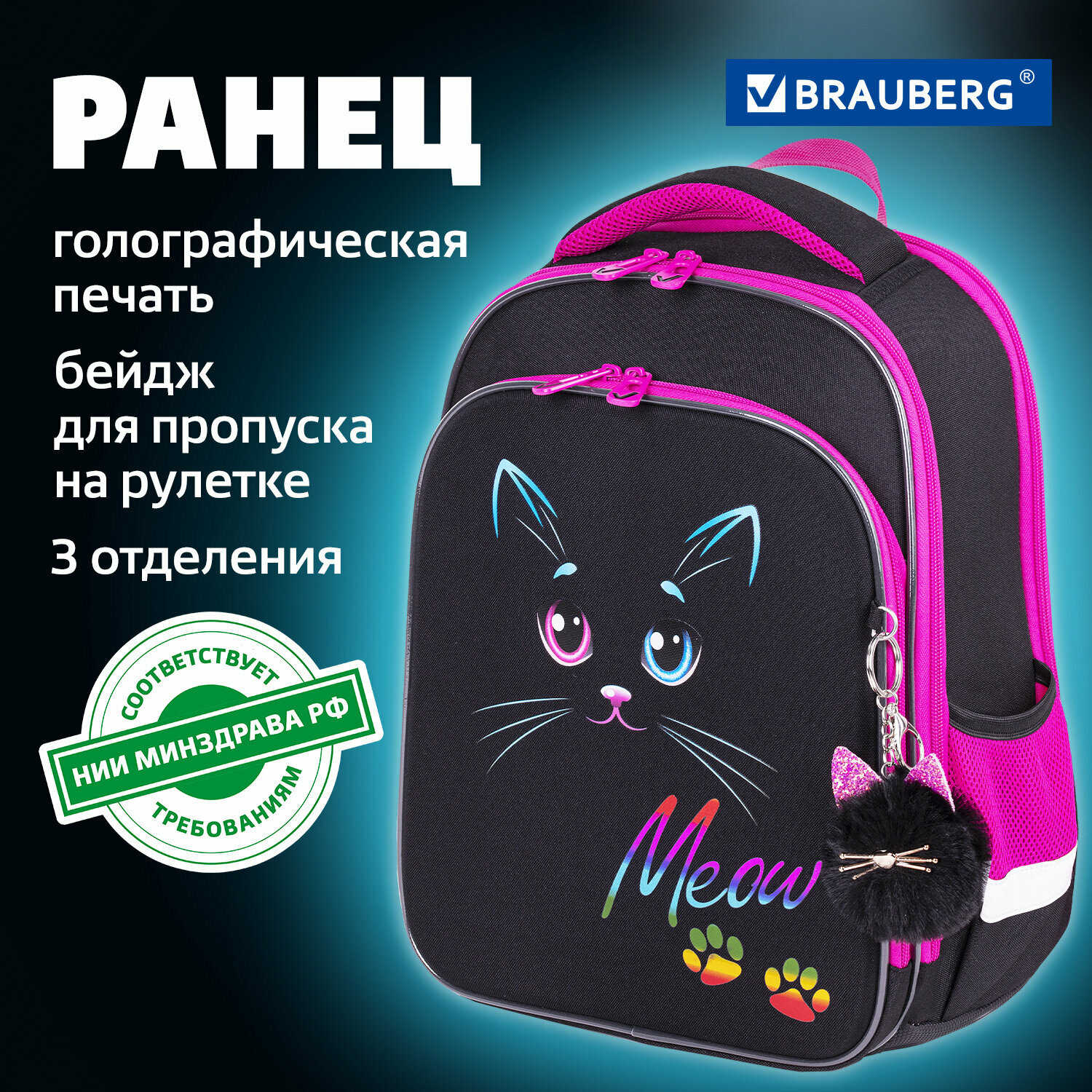 Отзывы на Ранец / рюкзак / портфель школьный для девочки первоклассницы Brauberg Quadro, 3 отделения, с брелком, Black cat, 37х28х18 см, 271358