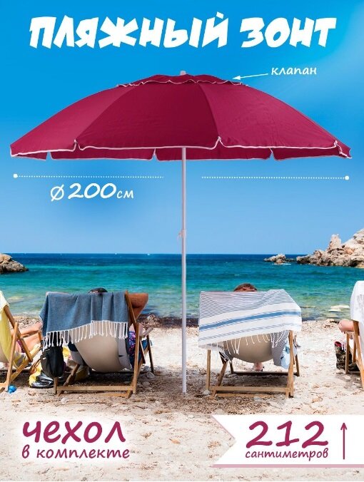 Зонт пляжный большой складной, садовый от солнца для отдыха 2 м в чехле, (бордовый) 200/8kN 3 290 ₽