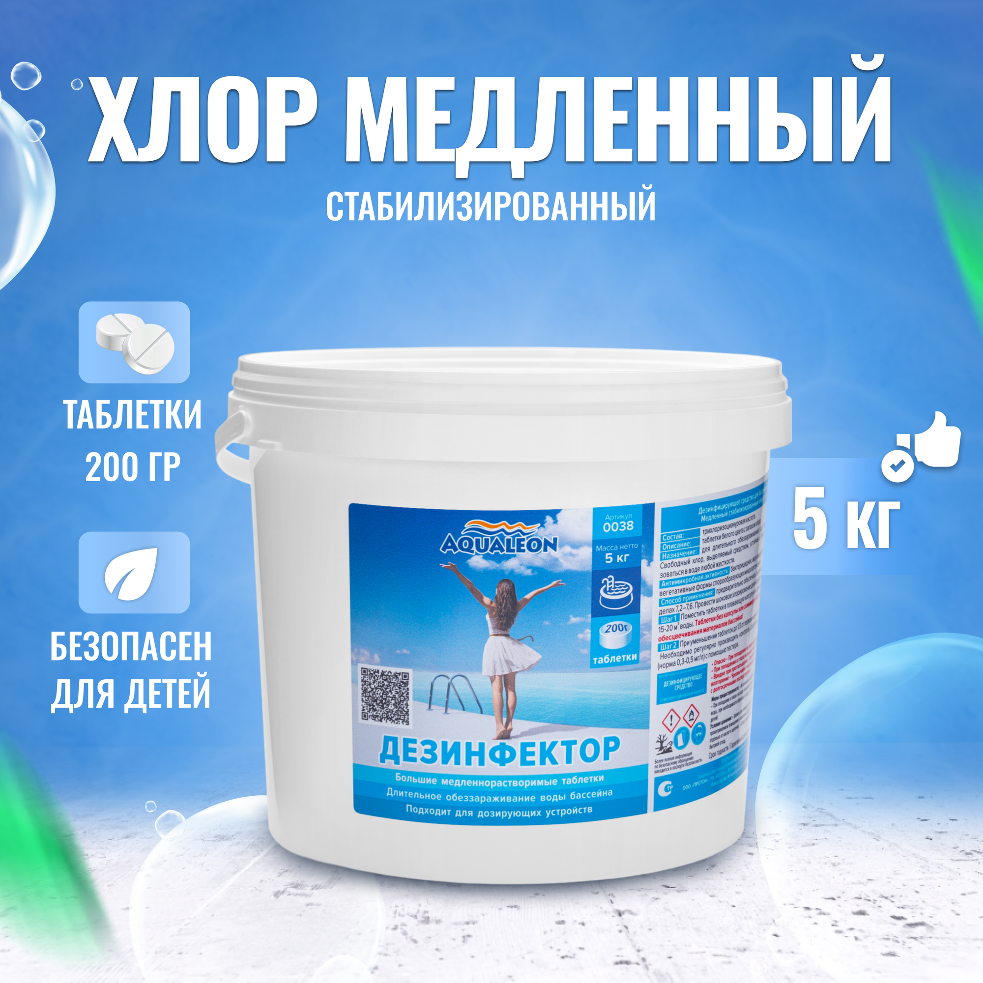 Дезинфектор медленный хлор Aqualeon в таблетках по 200 гр, 5 кг 6 039 ₽