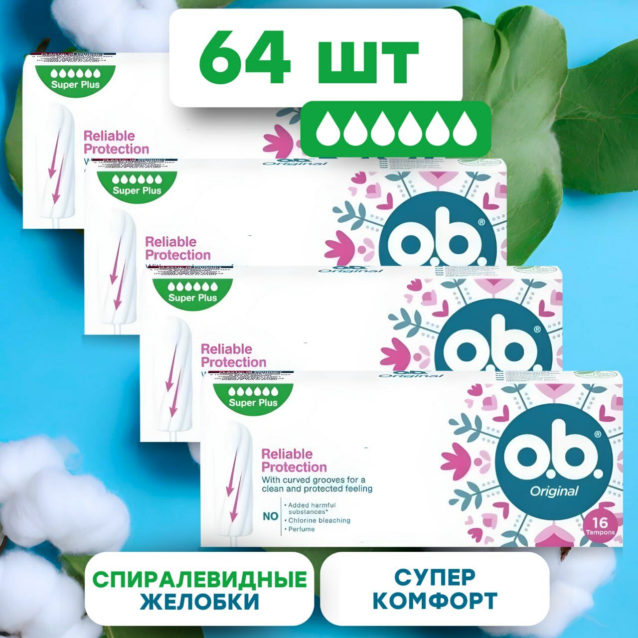 10 цен на Тампоны гигиенические женские O.B. Original Super Plus (obi/оби супер плюс для женщин для интимной гигиены), 4 х 16 шт.