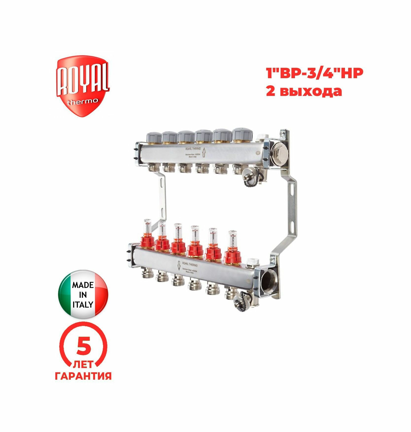 Коллектор нерж. в сборе с расходомерами 1" ВР-3/4" НР, 2 выхода Royal Thermo