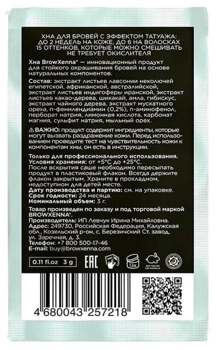 | Дополнительная информация | одного флакона хны в среднем хватает на 100 процедур; окрашивание сохраняется до 14 дней на коже и до 7 недель на волосках |