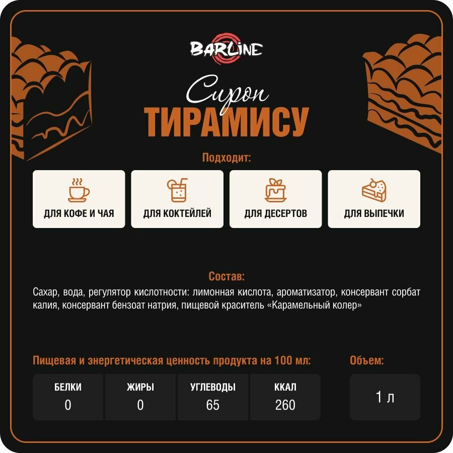 Сироп Barline Тирамису (Tiramisu), 1 л, для кофе, чая, коктейлей и десертов, пластиковая бутылка, Барлайн информация: