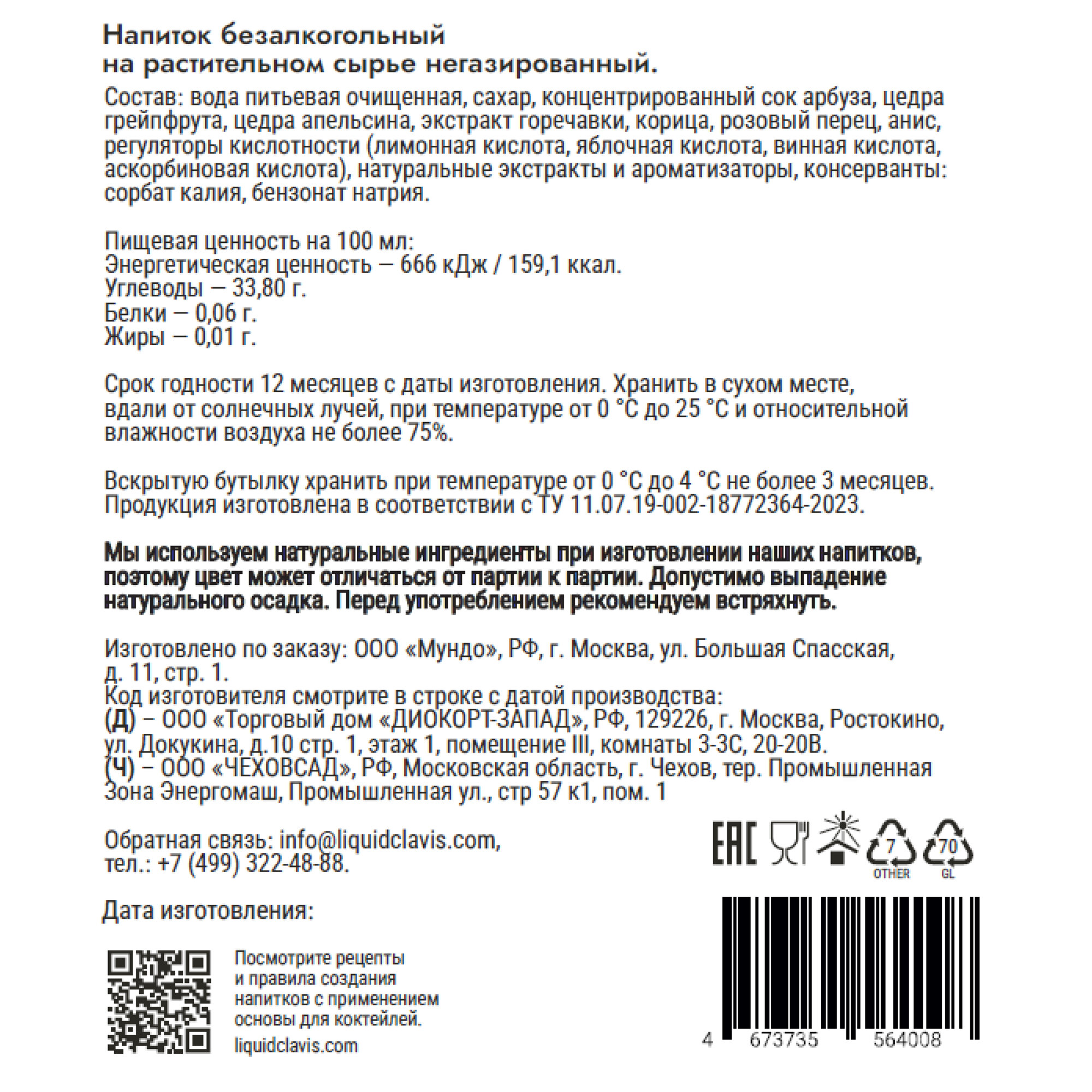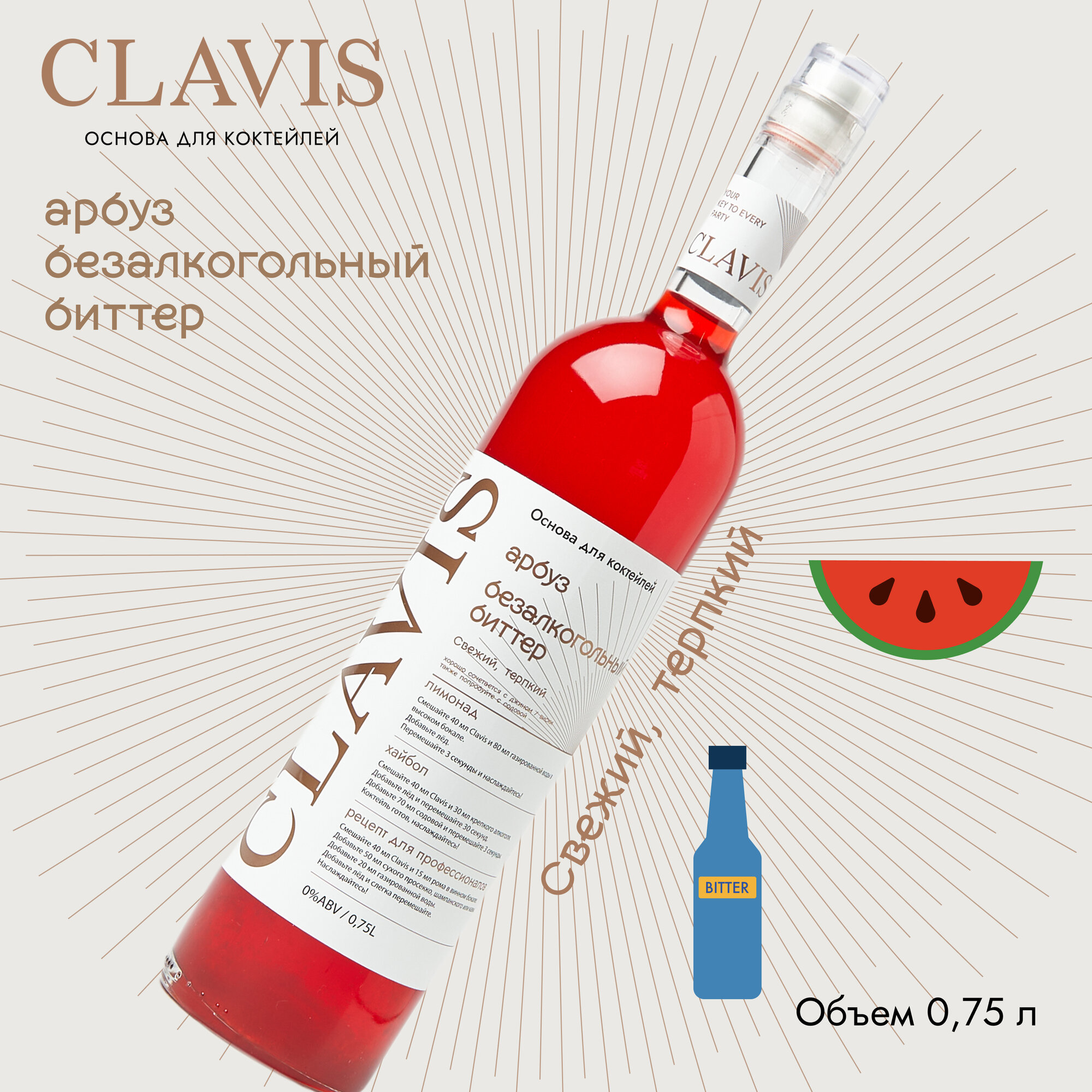 Основа для 15 коктейлей CLAVIS Арбуз, Безалкогольный биттер, 750 мл информация: