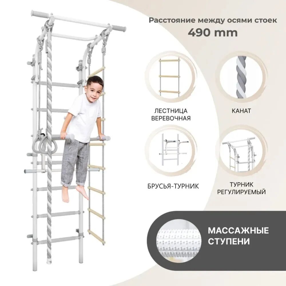 | Комплектация | гимнастические кольца / канат / качели / лестница / трапеция / турник / турник-брусья |