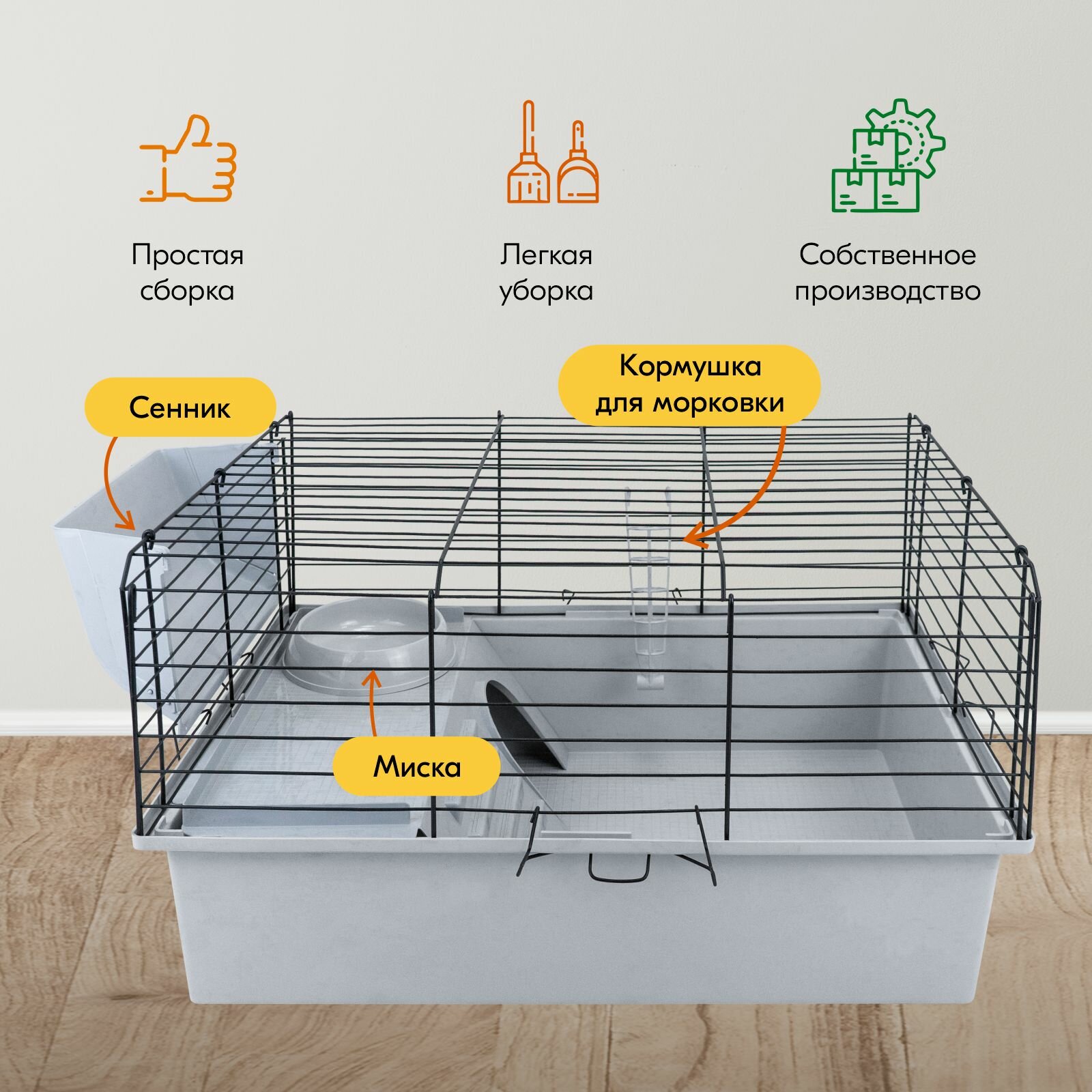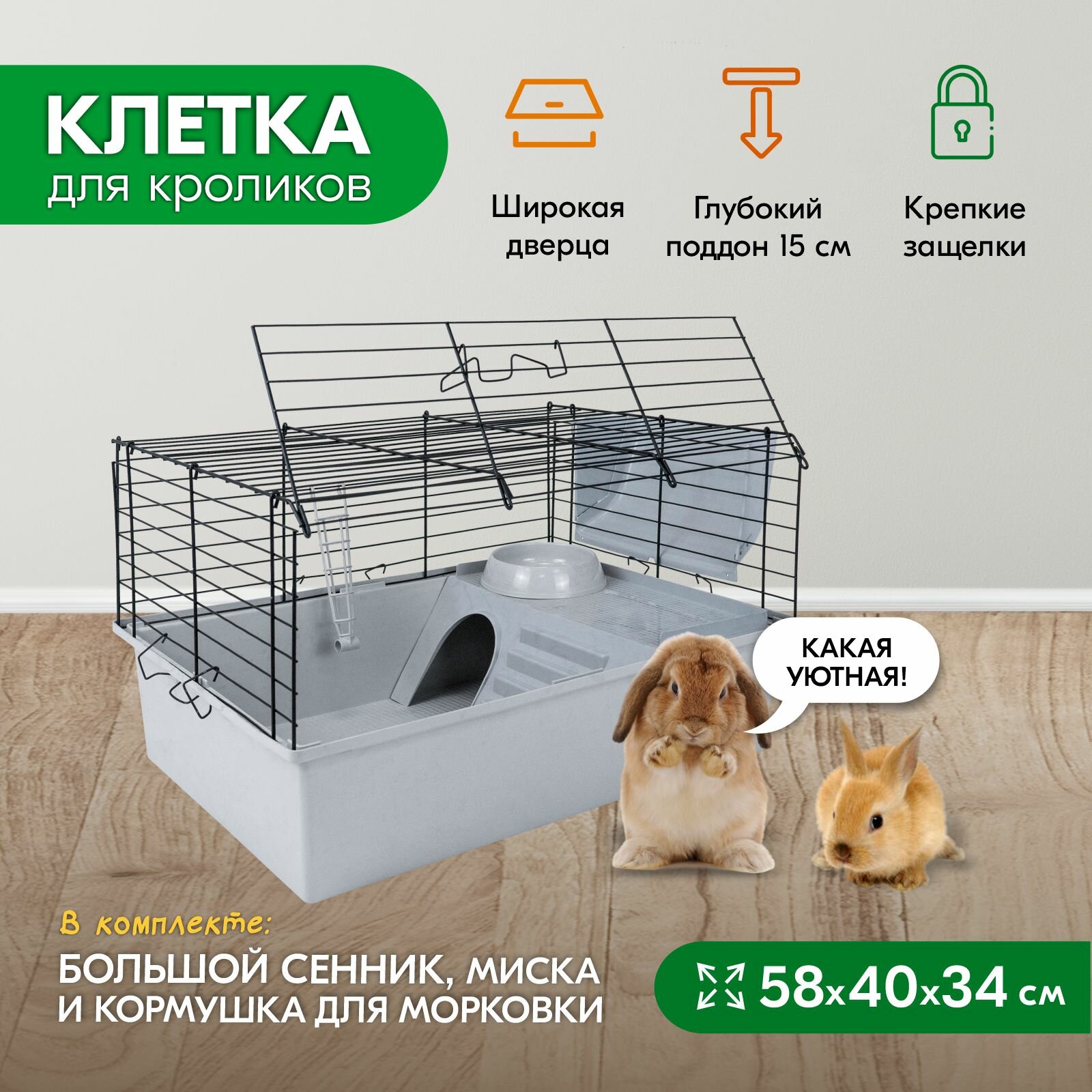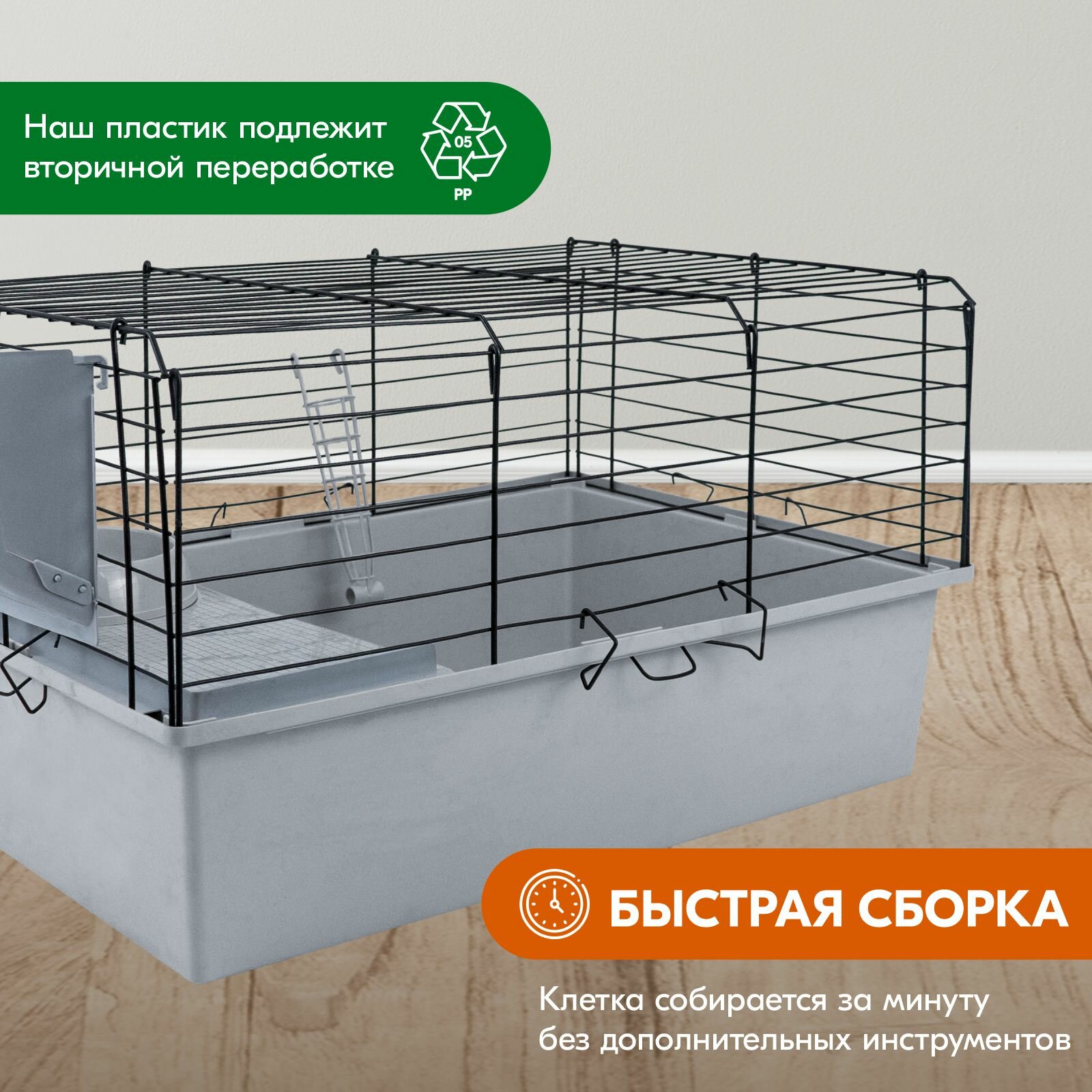 Отзывы на Клетка для кроликов PetTails №1 складная, шаг прута до 25мм, 58*40*h34см (+миска, 2 кормушки) светло-серый-черн