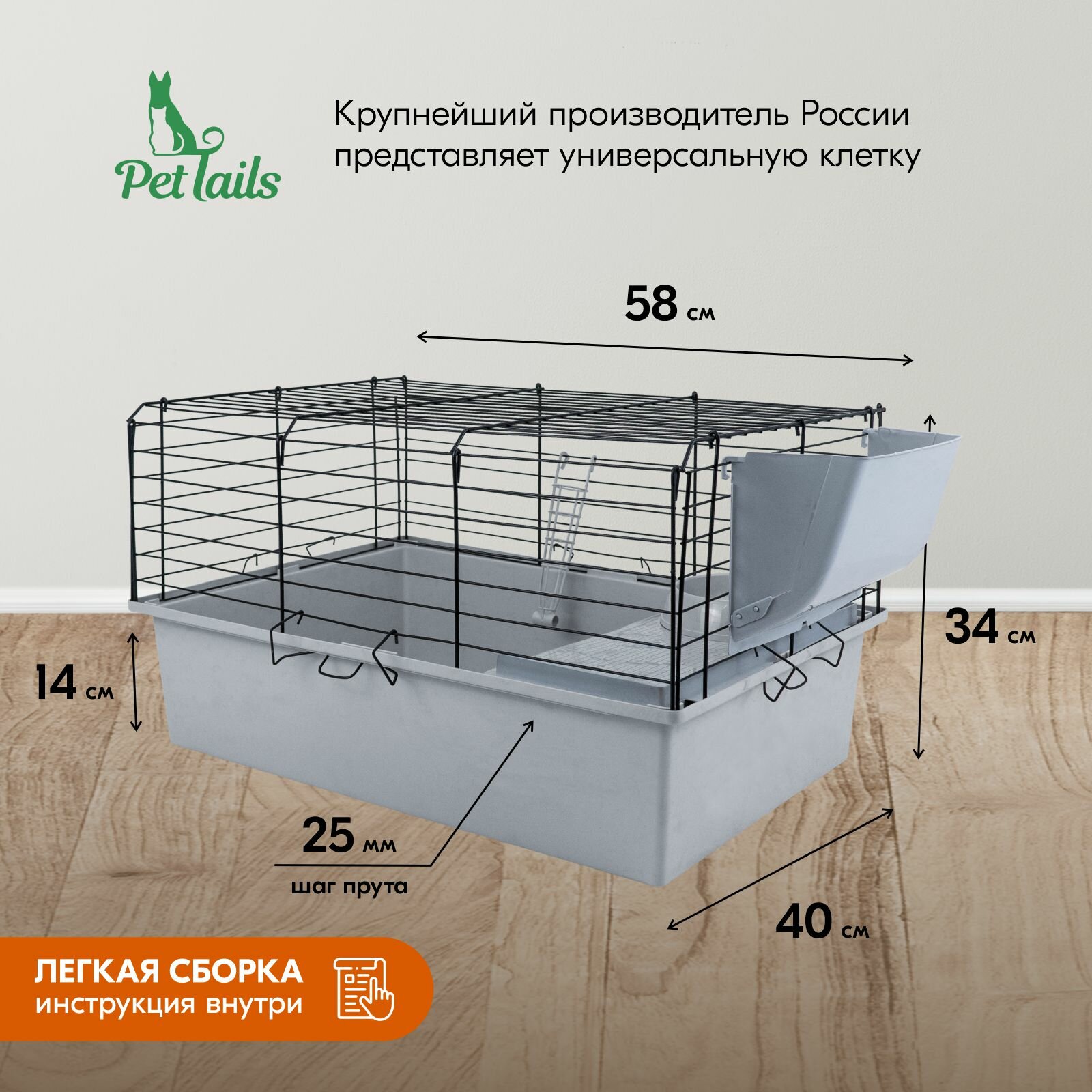 Клетка для кроликов PetTails №1 складная, шаг прута до 25мм, 58*40*h34см (+миска, 2 кормушки) светло-серый-черн информация: