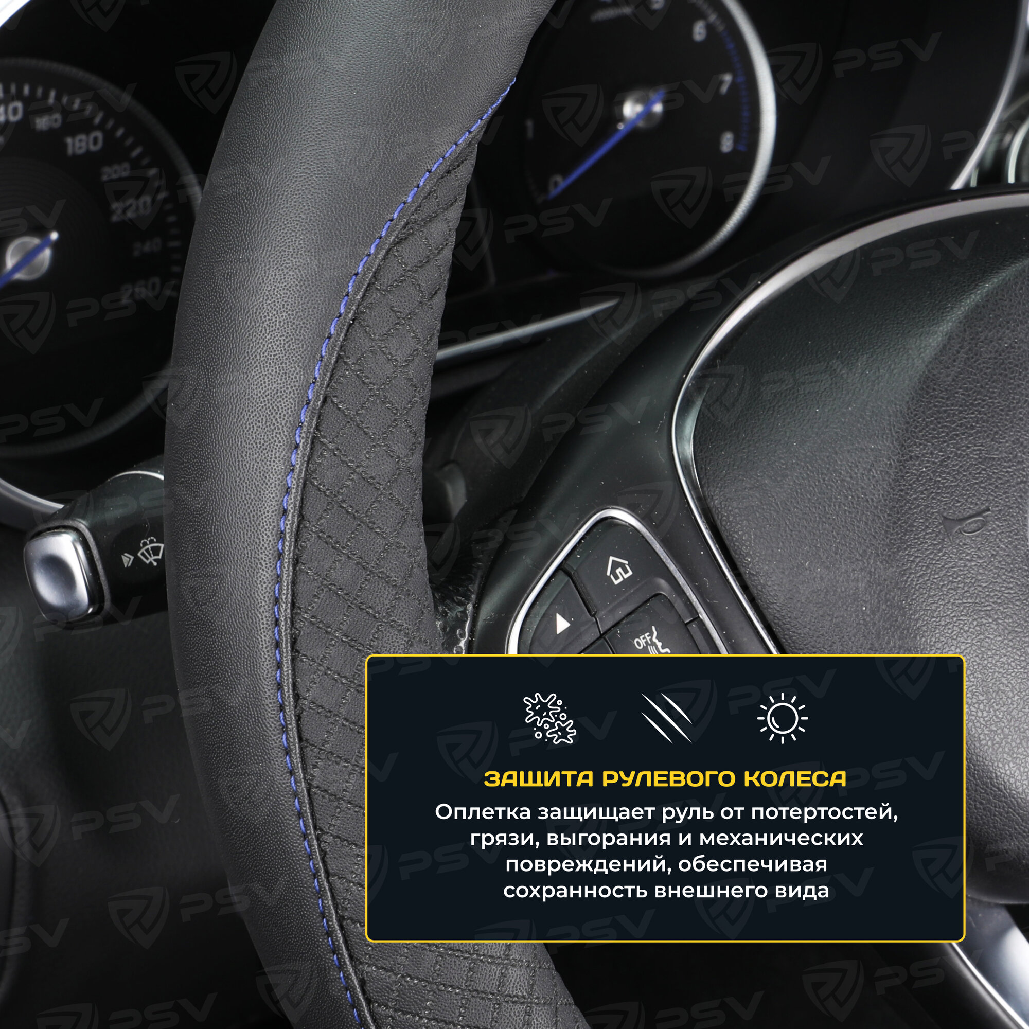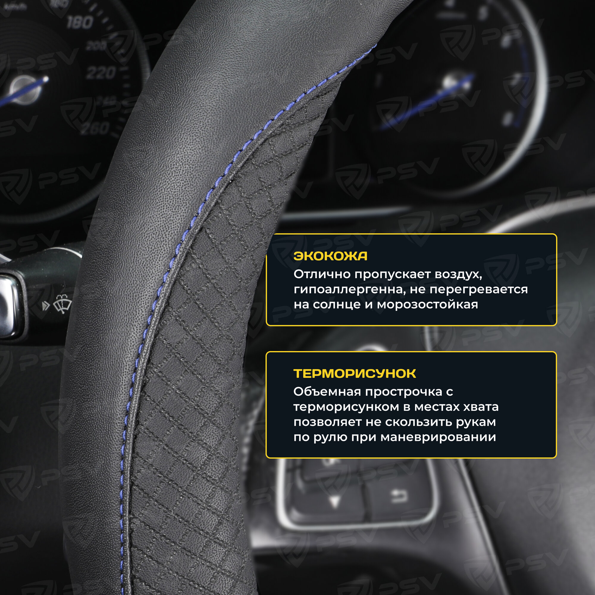 Оплетка чехол на руль PSV GREAT (Черный, строчка синяя) M 37-39 см, экокожа, 136827 информация:
