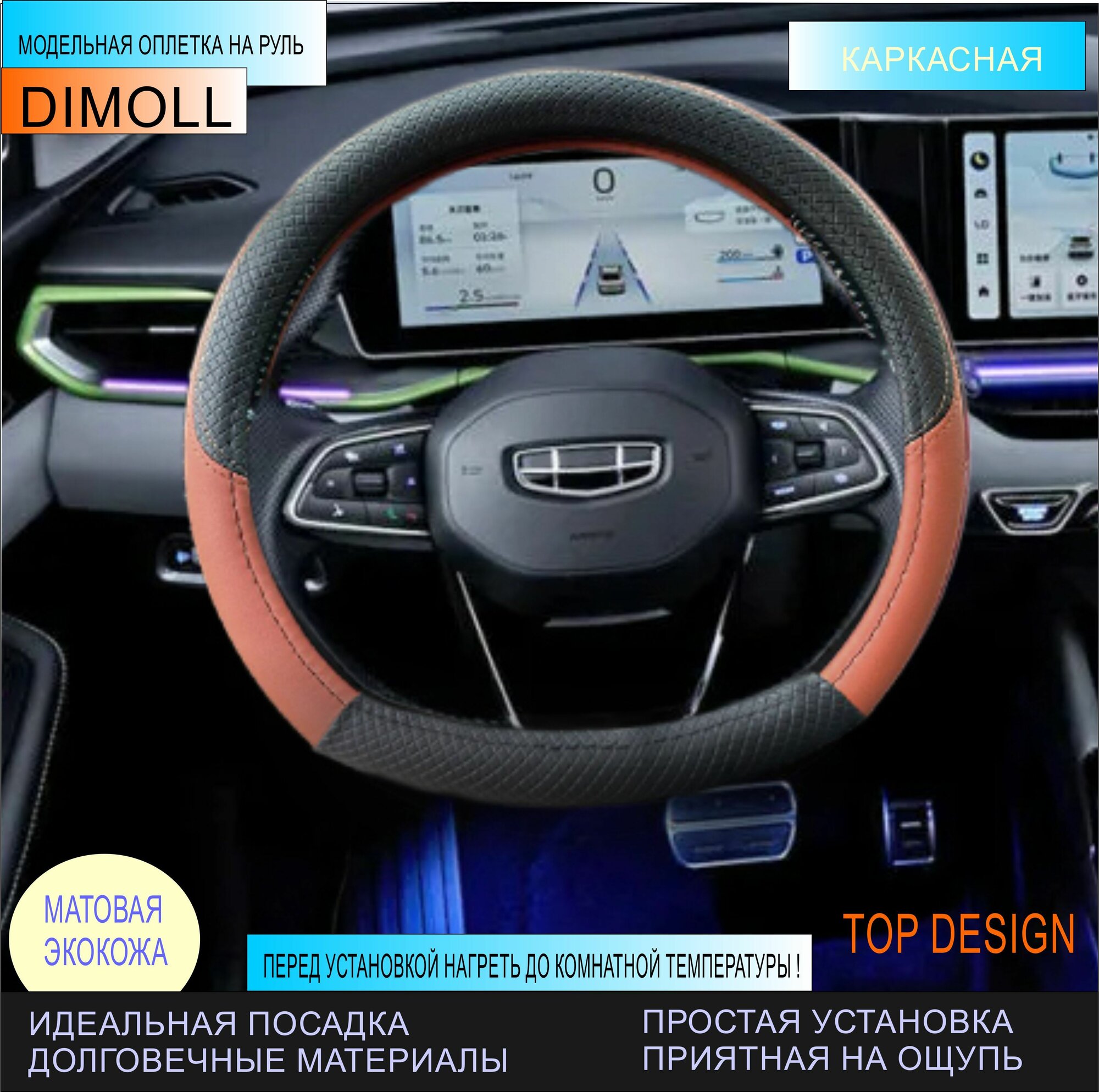 Отзывы на Оплетка (чехол) на D образный руль, скошенный снизу каркасная Geely Atlas Pro 2021 - н.в. экокожа, черная, рыжая, коричневая вставка