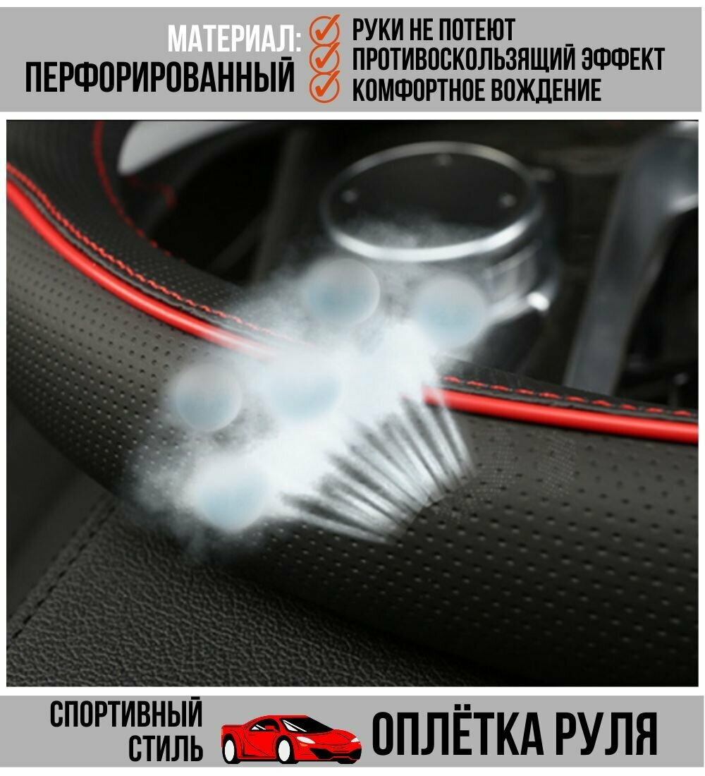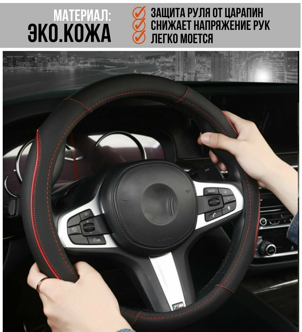 10 цен на Оплетка для руля автомобиля/ Good Ideas / черный чехол с красной строчкой, диаметр 38 см