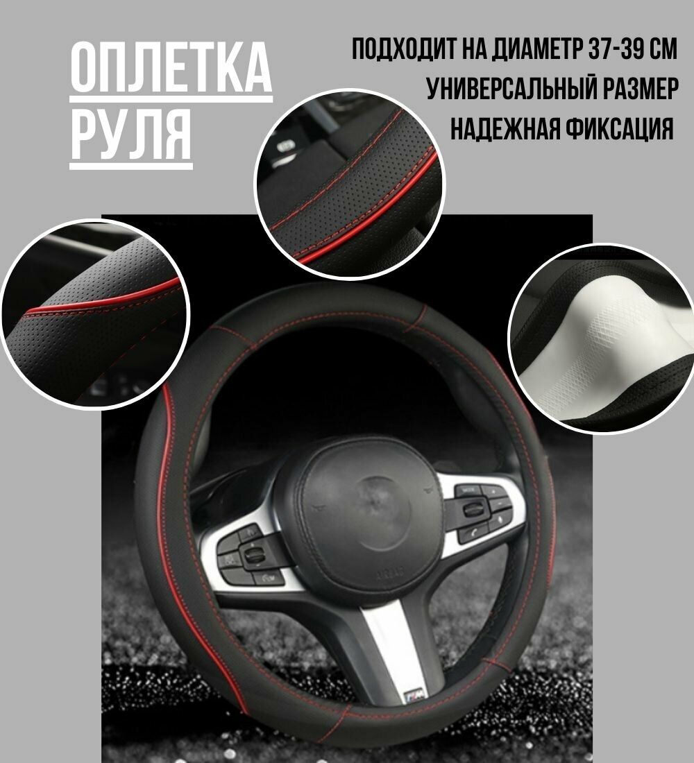 Оплетка для руля автомобиля/ Good Ideas / черный чехол с красной строчкой, диаметр 38 см информация: