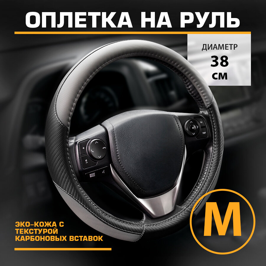 10 цен на Оплетка на руль эко-кожа с текстурой карбоновых вставок Kraft размер "M" , 38 см , Черно-серая