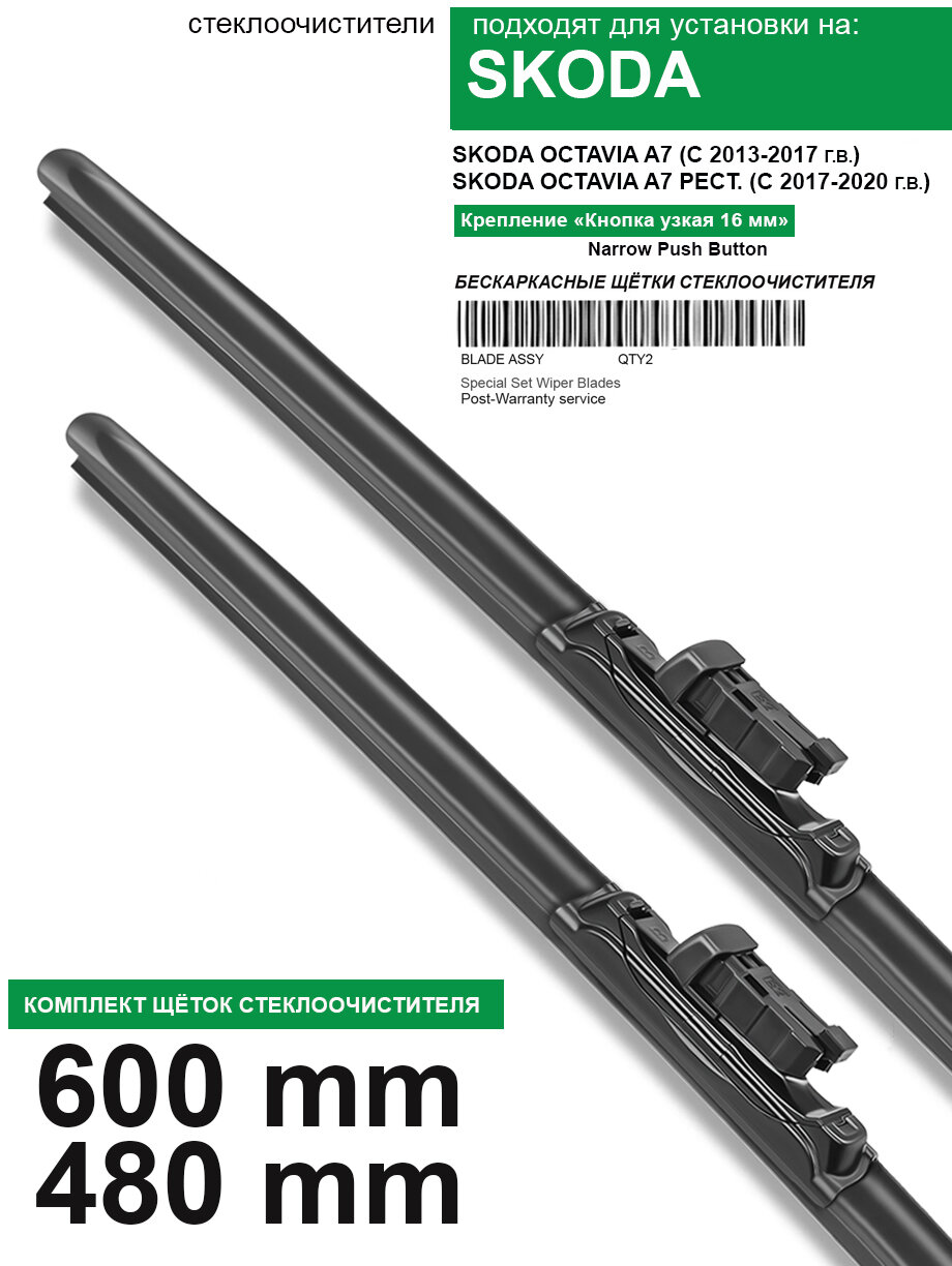 Щетки стеклоочистителя для Skoda Octavia A7 - бескаркасные дворники Шкода Октавия А7 600 480 мм комплект. информация: