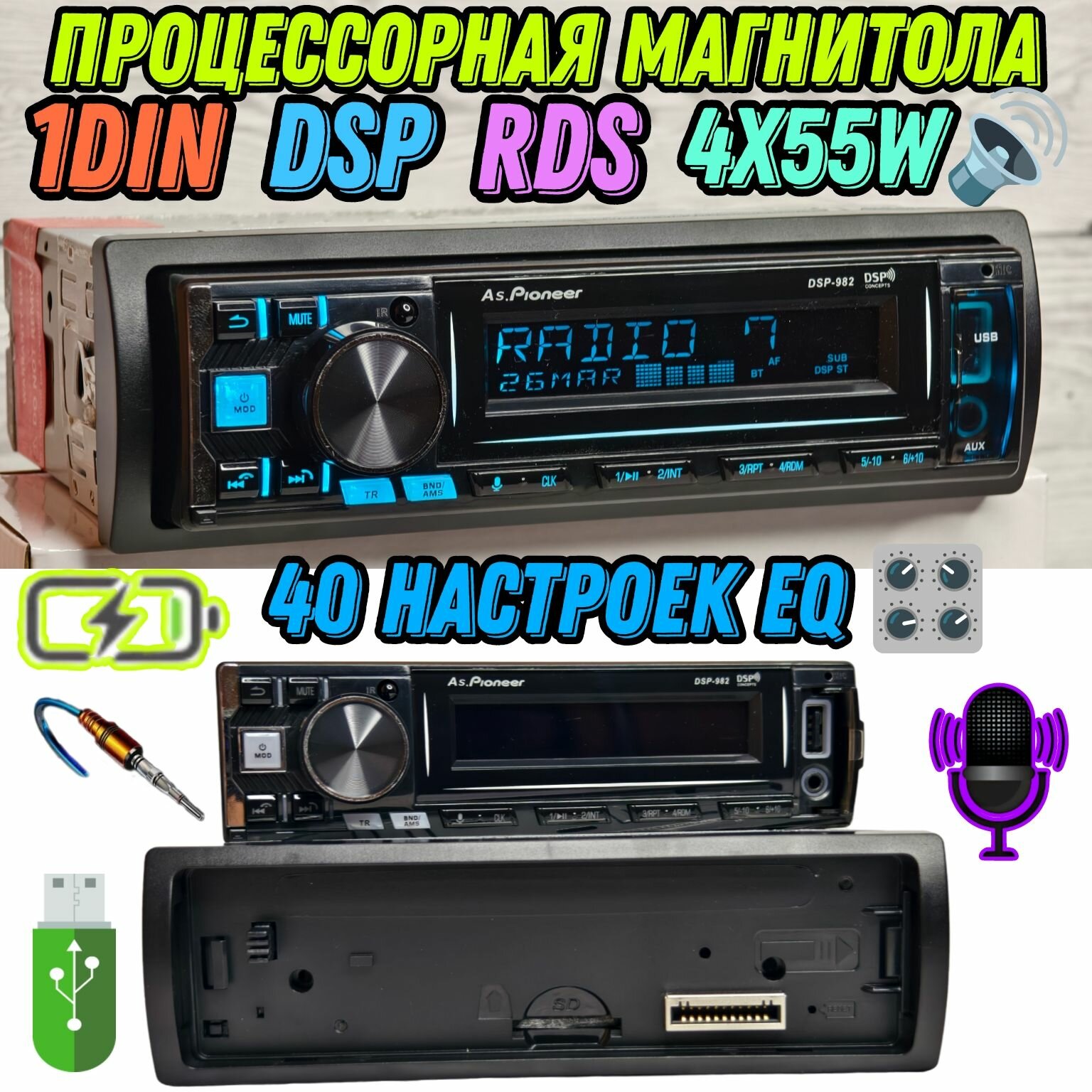 Отзывы на DSP процессорная магнитола Pioneer со сьемной панелью / 40 настроек эквалайзера / Bluetooth / RDS / USB / AUX / громкая связь