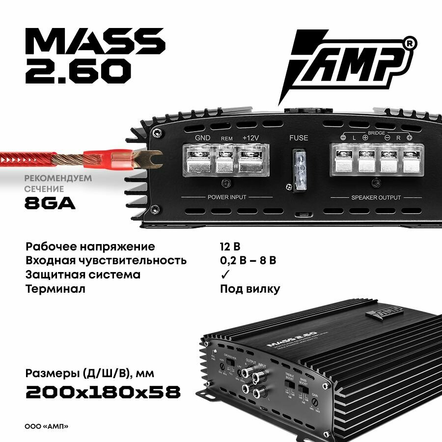Комплект усилителя AMP MASS 2.60 с проводами для установки информация: