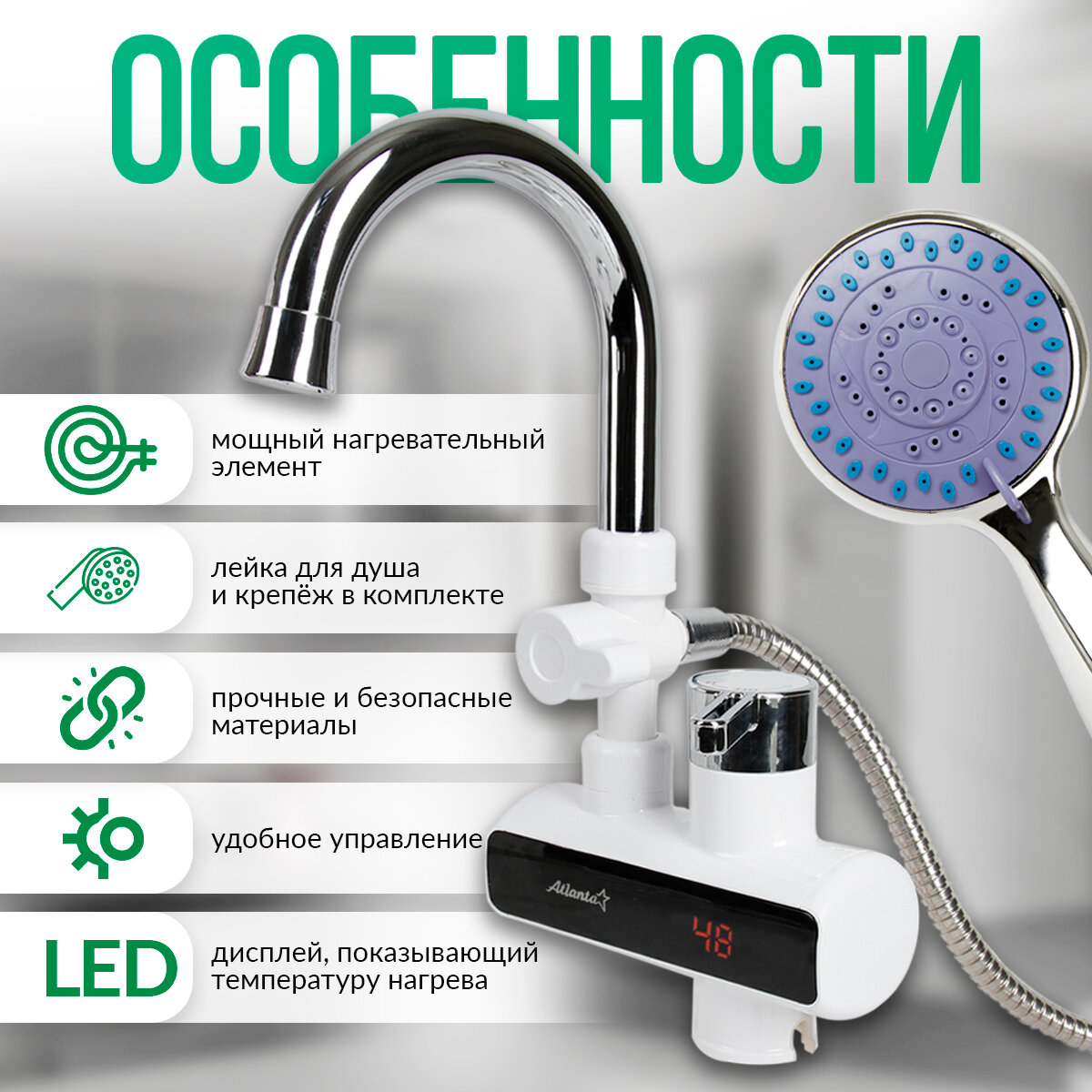 Водонагреватель Atlanta ATH-7429, 3500 Вт, гибкий излив, LED дисплей, нагрев потока в диапазоне 30-85 °C.