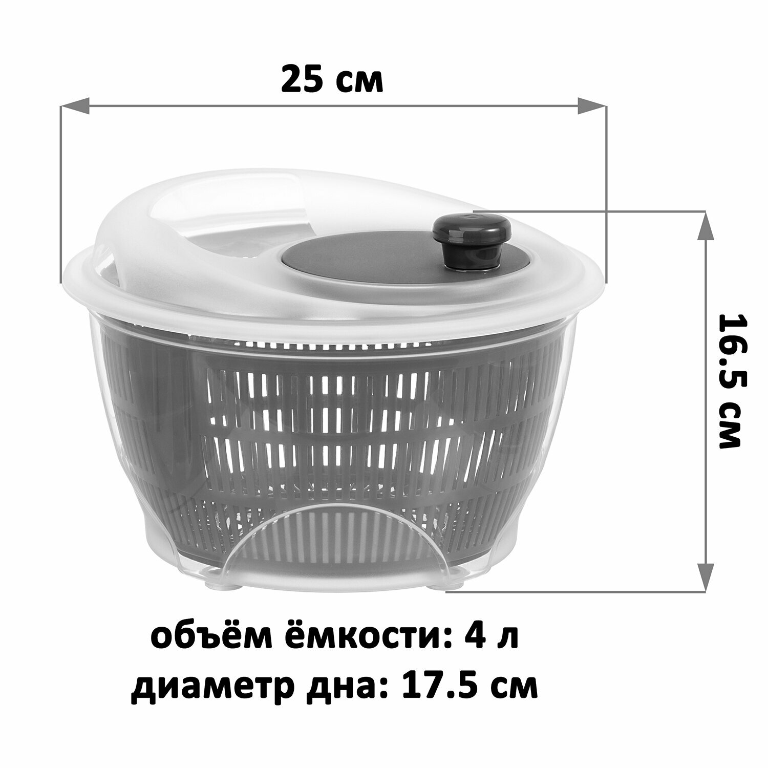 | Дополнительная информация | Ёмкость для сушки зелени"Spinner" 4 л, прозрачная/графитовая , 25х25х16,5 см, диаметр дна - 17,5 см |