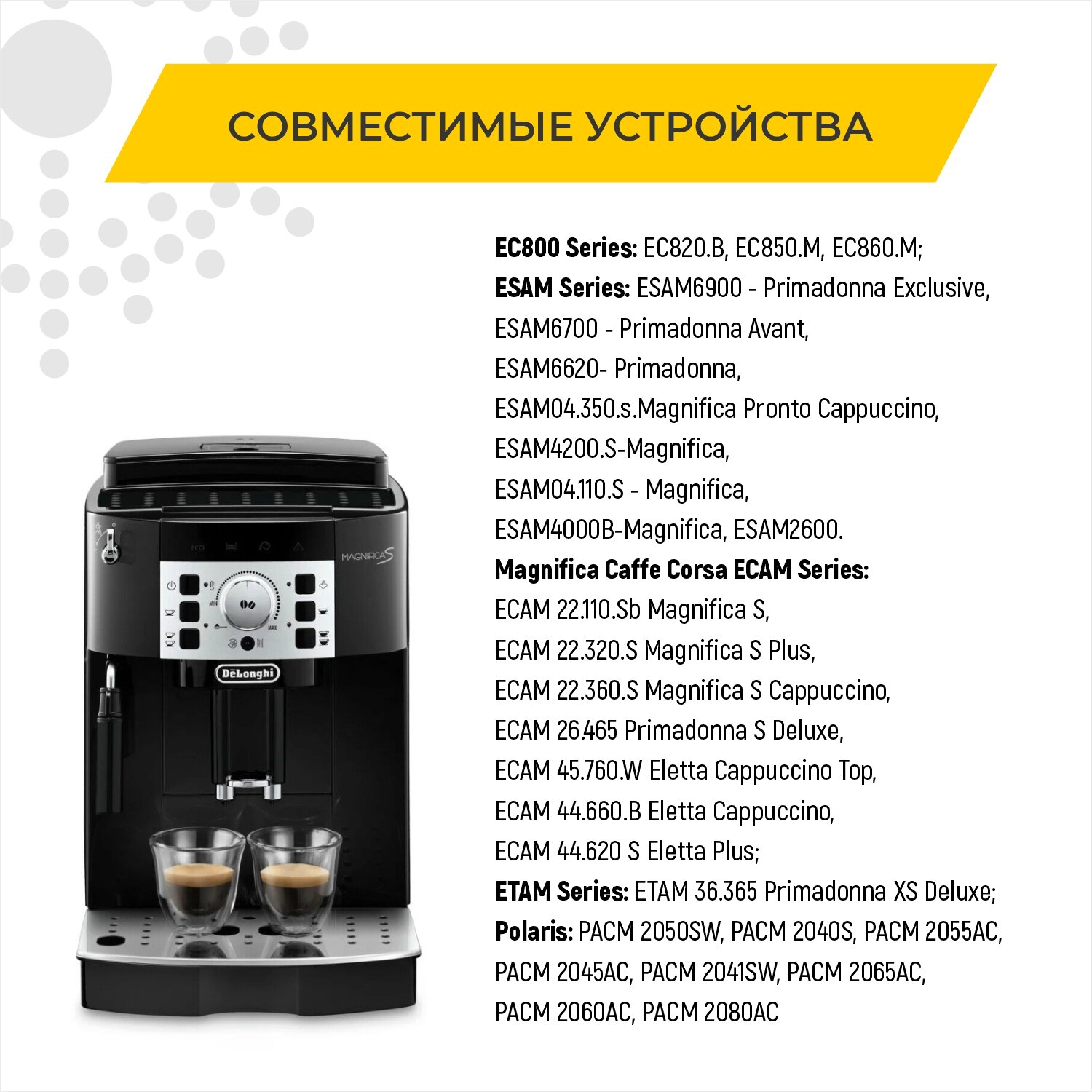 | Модель кофеварки/кофемашины | De'Longhi ETAM, De'Longhi ECAM, De'Longhi ESAM 69ХХ |