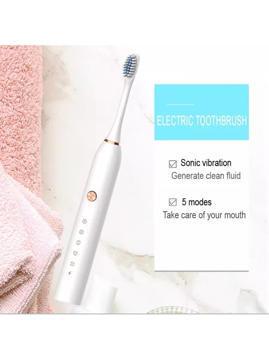 Электрическая зубная щетка Smart Sonic, длительный срок службы, 6 насадок, белый.