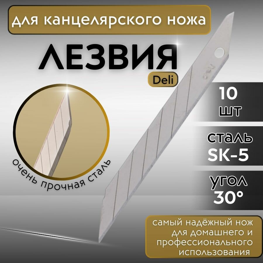 Лезвия сменные для канцелярских ножей 9 мм. 30 градусов, сталь SK5 (Японский сплав), набор 10 шт. Серебристые. информация:
