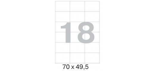 | Дополнительная информация | размер этикетки, см.: 7,0х4,95; кол-во этикеток на листе: 18; верхнее поле, см: 0; боковые поля, см: 0; шаг по вертикали, см: 4,95; шаг по горизонтали, см: 7; высота наклейки, см: 4,95; ширина наклейки, см.: 7,0; число наклеек по горизонтали: 3; число наклеек по вертикали: 6. |
