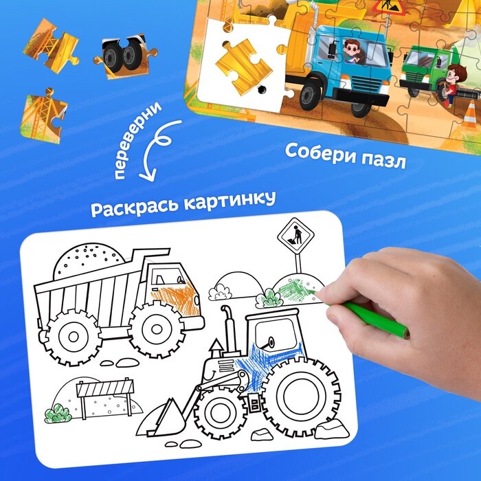 Пазл в рамке «Машины на стройке», 34 детали + раскраска, разивающий набор для детей и малышей информация: