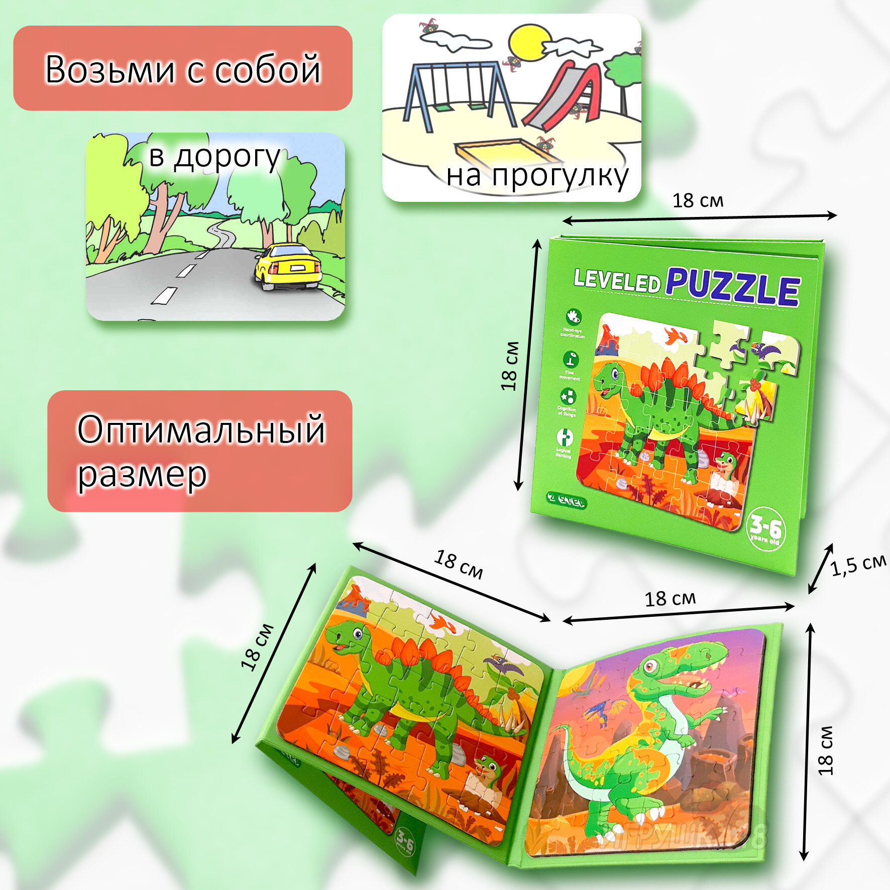 Магнитный пазл для малышей 3 в 1 / Пазл на магнитах игра в дорогу / Набор пазлов разного уровня сложности, 75 деталей, Динозавры, темно-зеленый информация: