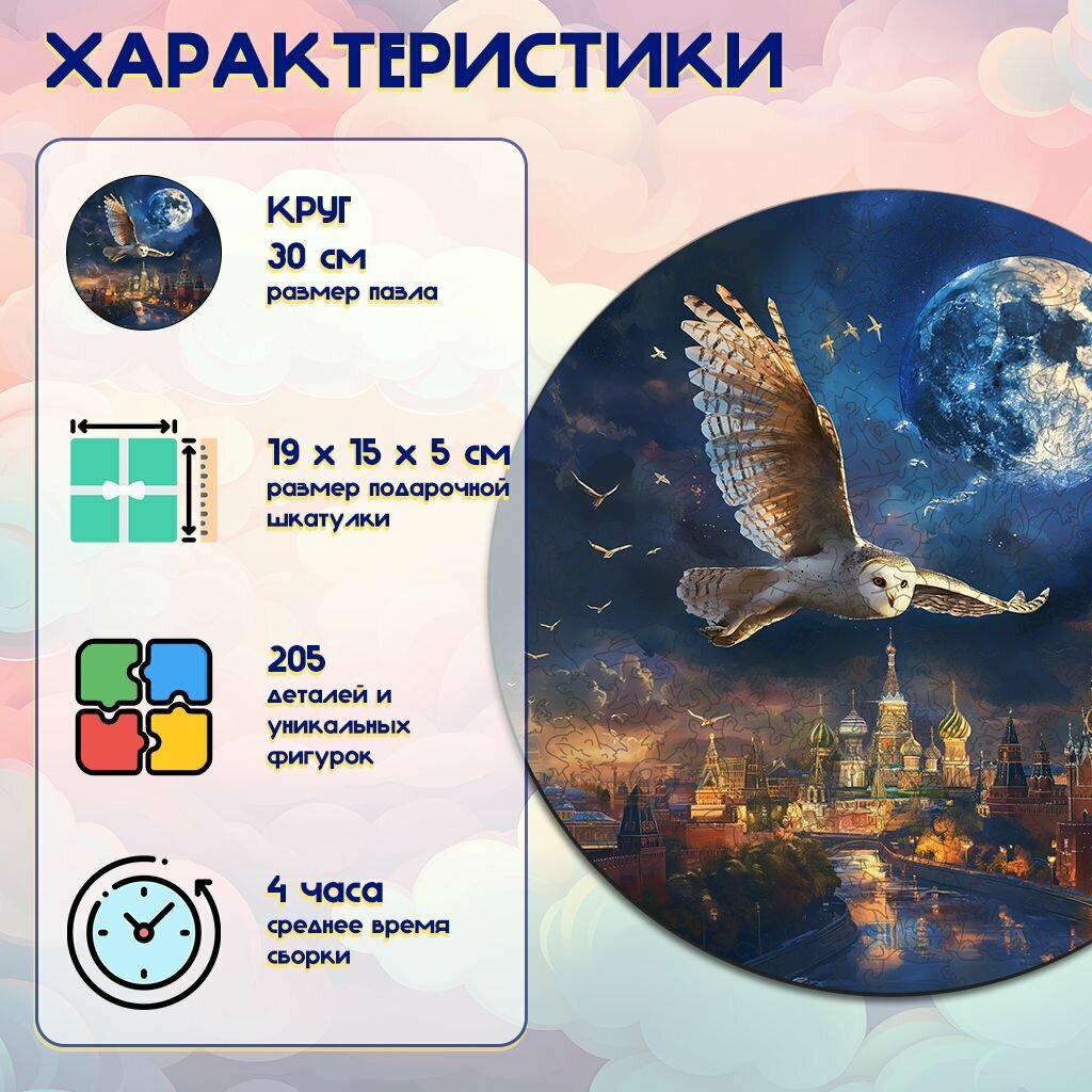 Деревянный пазл BoberBox "Сова над Москвой", 205 деталей информация: