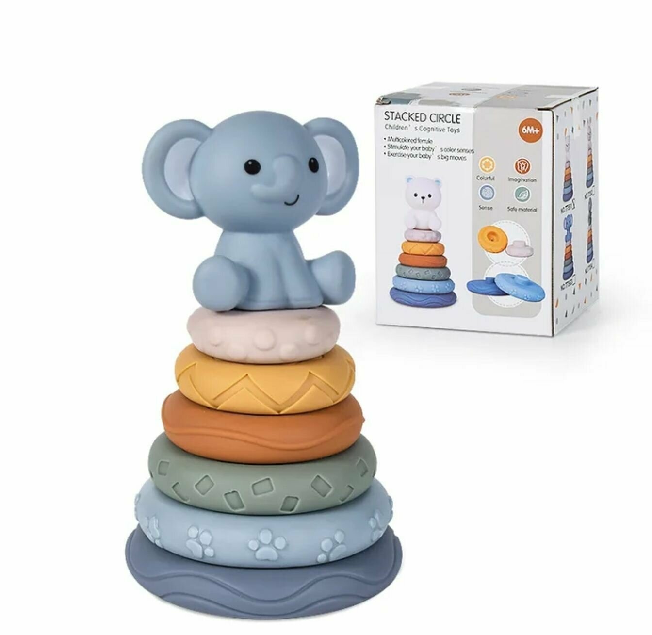 Развивающая мягкая детская силиконовая пирамидка грызунок с игрушкой Слоник, 7 элементов информация: