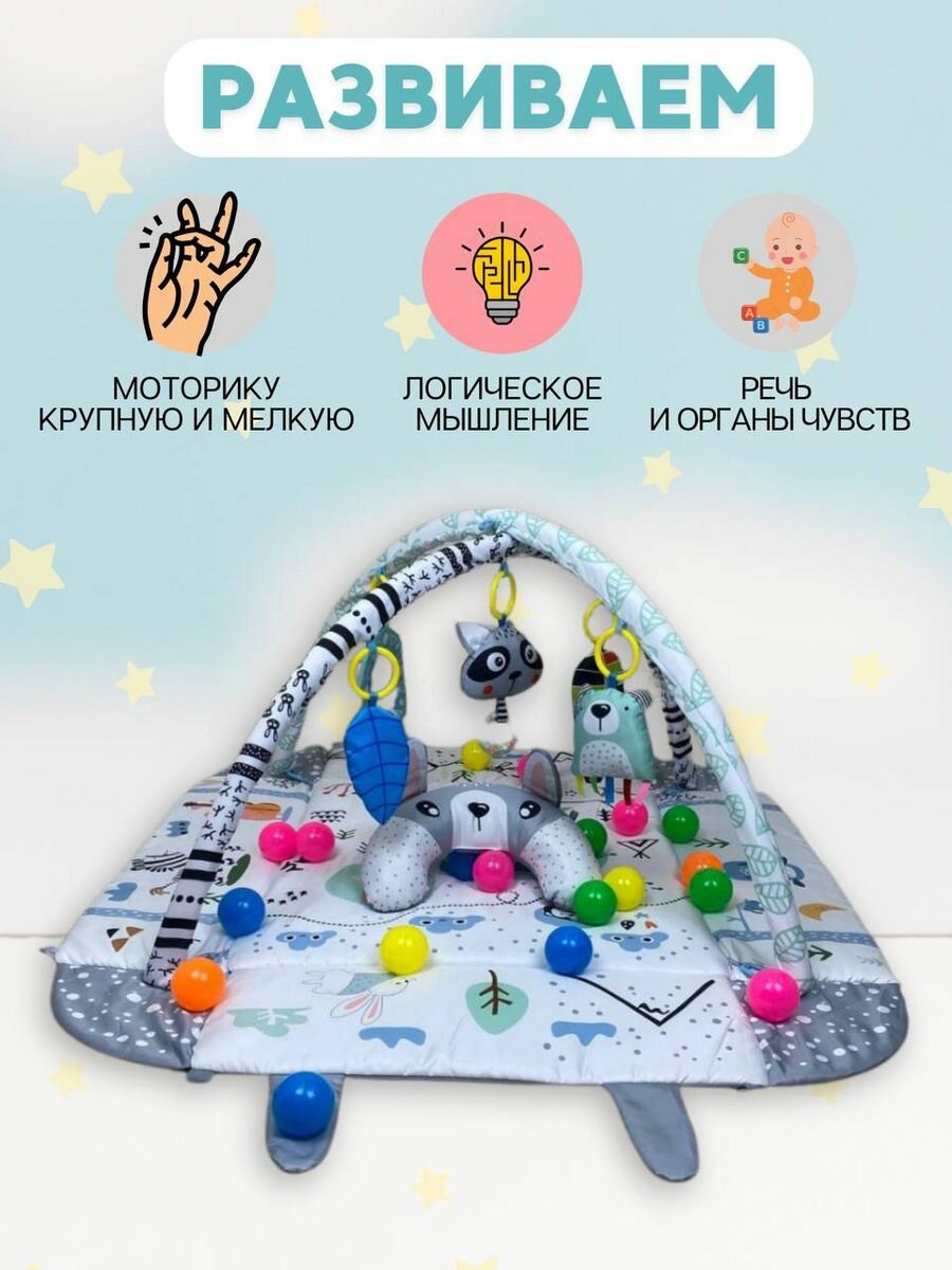 | Комплектация | коврик 1 шт. дуги 2 шт. шарики цветные 20шт. подушка 1 шт. игрушки 5 шт |
