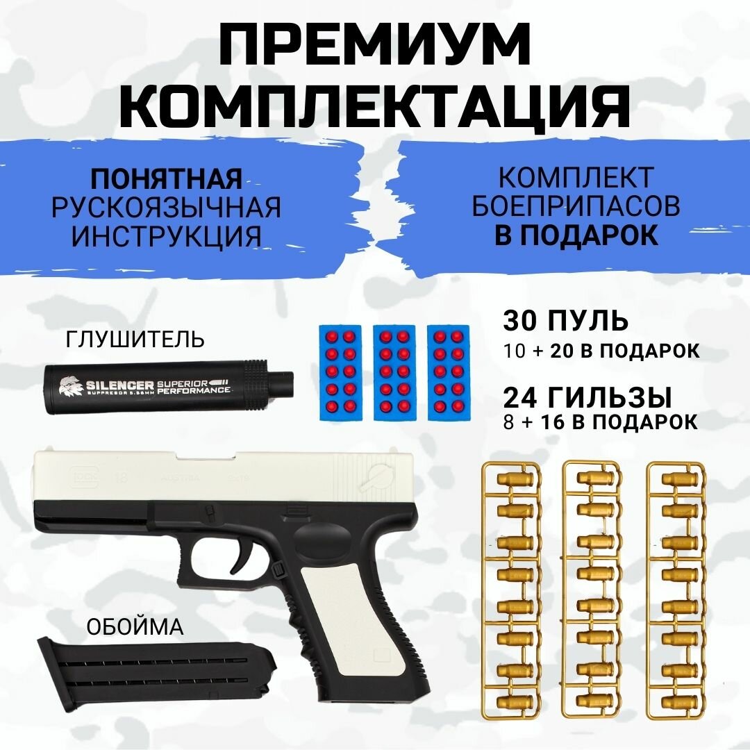 | Комплектация | Пистолет 1 шт, гильзы 24 шт, мягкие пульки 30 шт, съемный глушитель 1 шт, съемный магазин 1 шт, русскоязычная упаковка, русскоязычная инструкция |