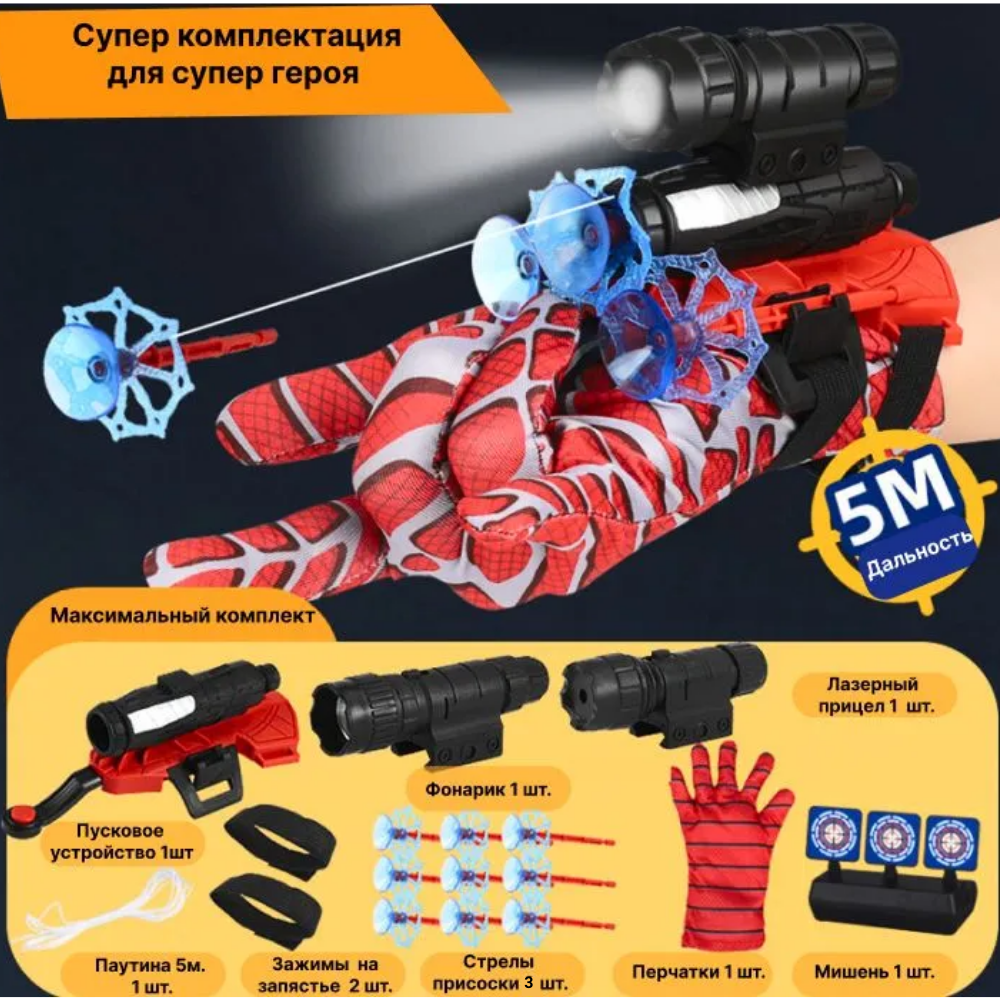 | Комплектация | Пусковое устройства 1шт; фонарик; лазерный прицел; мишень; перчатка; зажимы 2шт; стрелы 3шт; паутина |