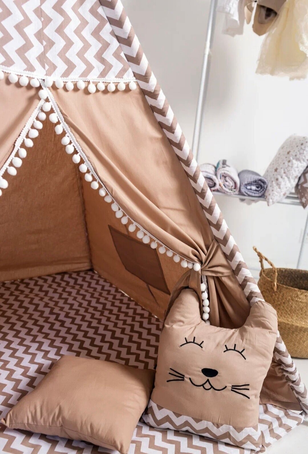 Детский Вигвам с ковриком, окошком, подушка-игрушка, подушка , флажки - 4 шт. и системой антискладывания Tipi Brown информация: