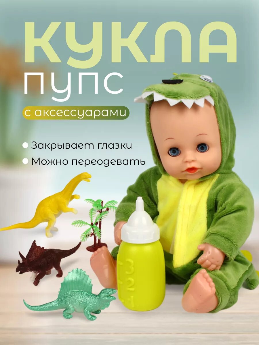 10 цен на Пупс кукла 30 см в костюме динозаврика с аксессуарами бутылочка и игрушки динозавры / 1 шт.