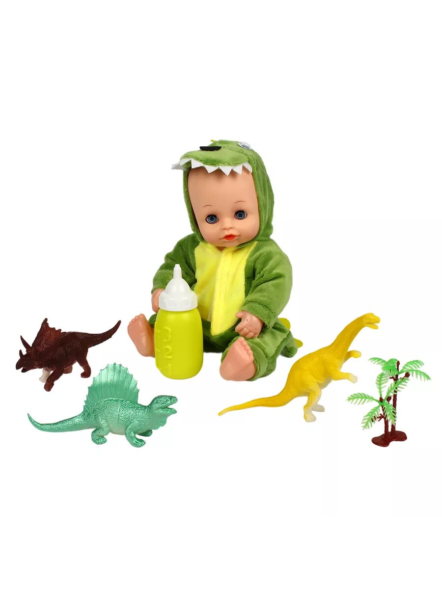 Пупс кукла 30 см в костюме динозаврика с аксессуарами бутылочка и игрушки динозавры / 1 шт. информация: