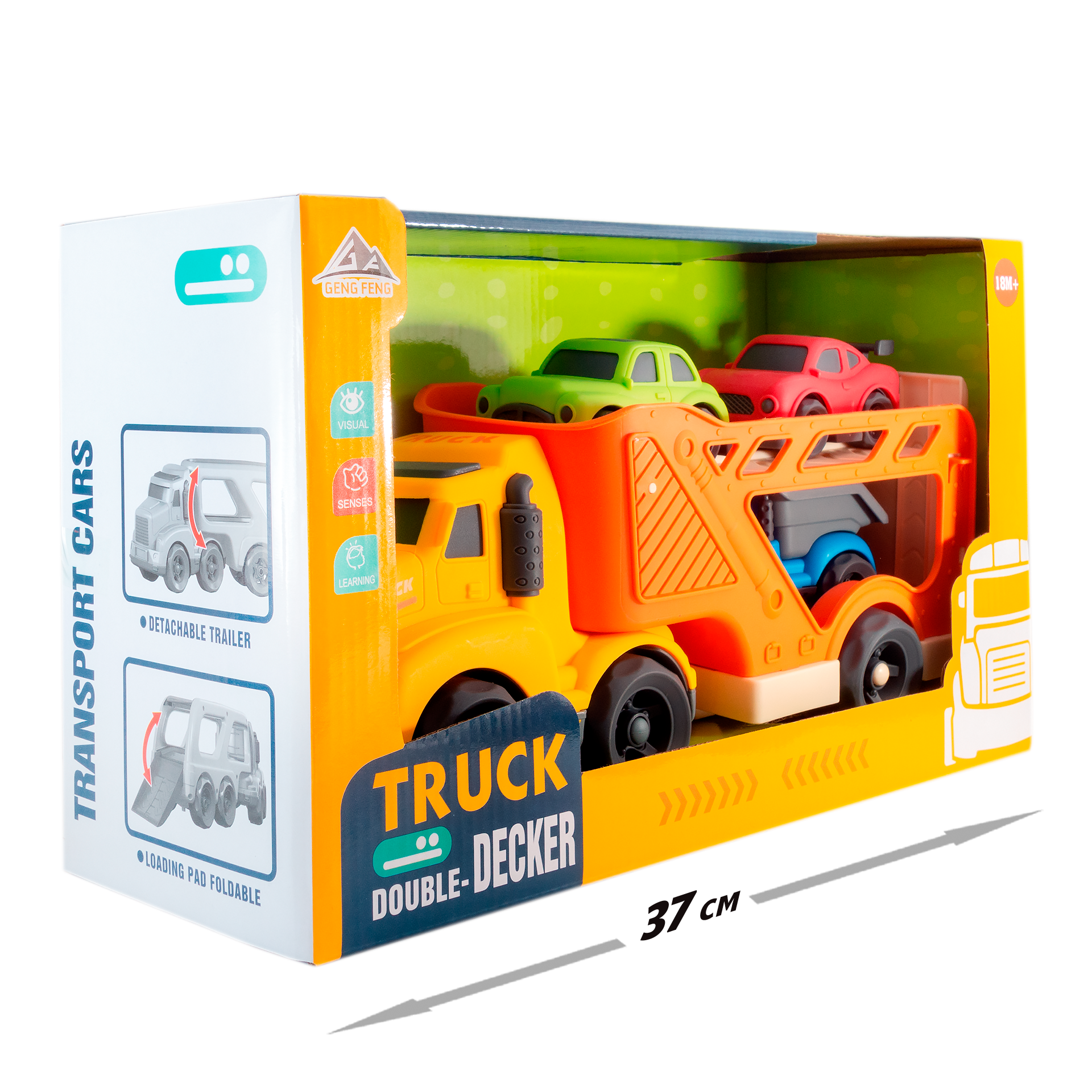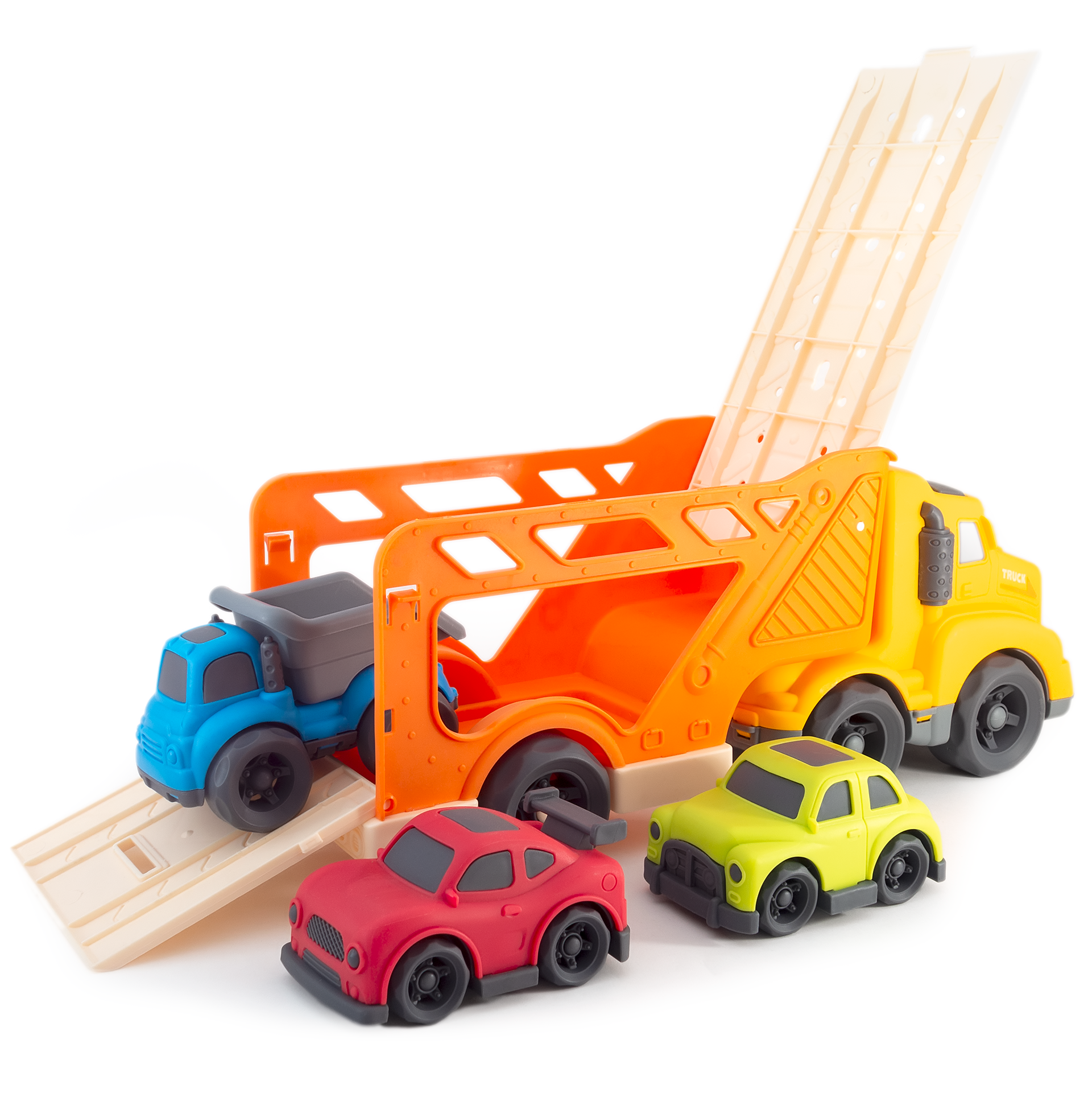 Отзывы на Набор Грузовик автовоз с прицепом и 3 машинками для мальчика от 1,5 лет. Большой перевозчик тягач 32 см со спортивными машинками и самосвалом. Эко-френдли игрушка и подарок