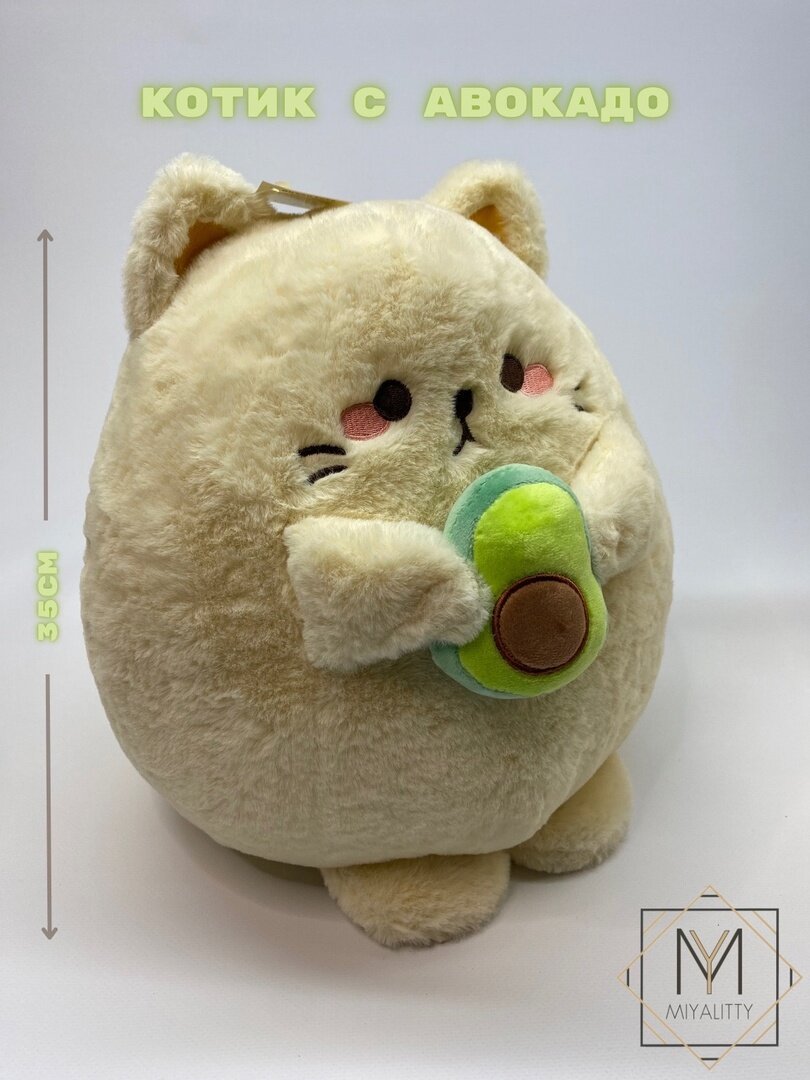 Мягкая игрушка плюшевый круглый кот с авокадо 35 см, кремовый информация: