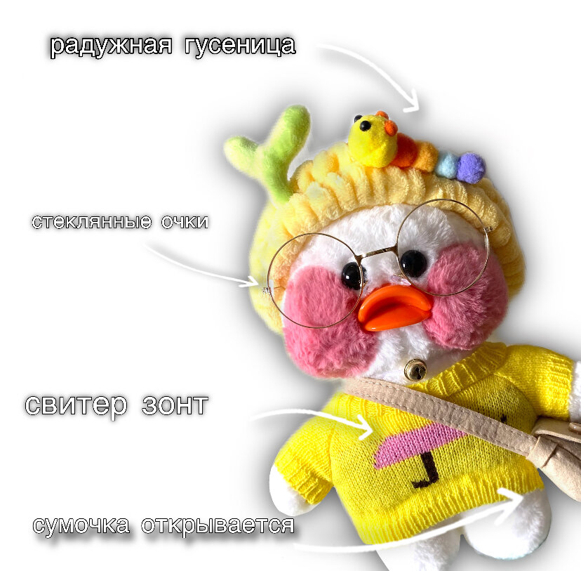 Белая утка LaLaFanFan в разной одежде. Утенок в очках. Мягкая плюшевая игрушка уточка лалафанфан. Утя лалафан, высота 30 см. Плюс подарок