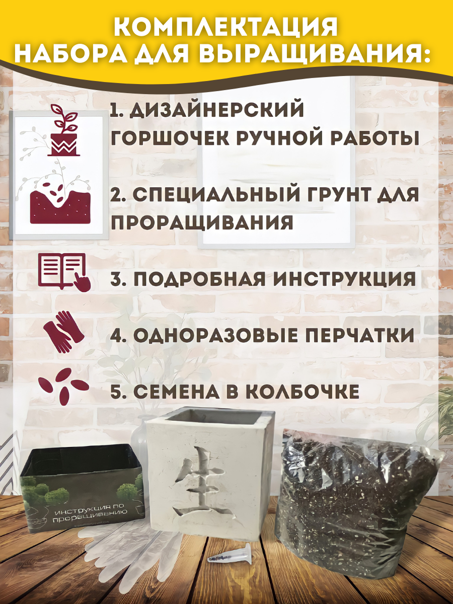 | Комплектация | подарочная коробка, кашпо из бетона, семена в защитной капсуле, умное удобрение, специальный грунт, пара одноразовых перчаток, инструкция по выращивания семян |