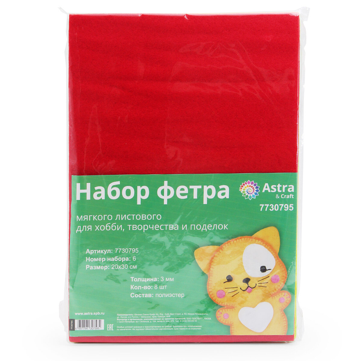 Набор фетра мягкого листового ассорти, 3 мм, 20х30 см, 8 шт, Astra&Craft (6) информация: