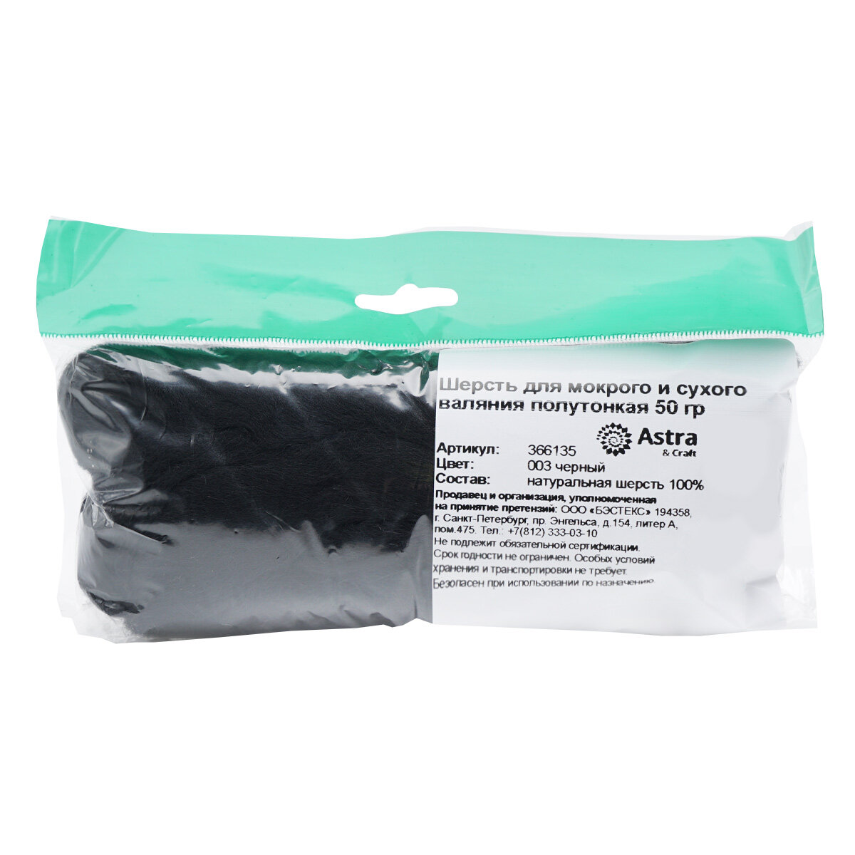 10 цен на Шерсть для валяния полутонкая, 50 г, Astra&Craft (003 черный)
