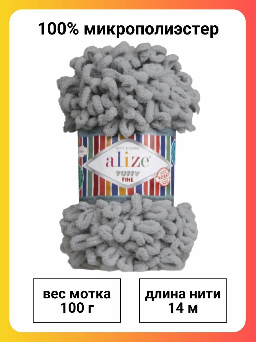 Пряжа для вязания руками с петлями ALIZE 'Puffy Fine' 100г, 14,5м (343 угольно-серый), 5 мотков информация: