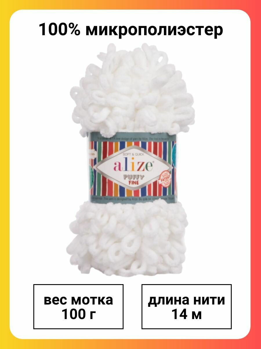 Пряжа для вязания руками с петлями ALIZE 'Puffy Fine' 100г, 14,5м (55 белый), 5 мотков информация: