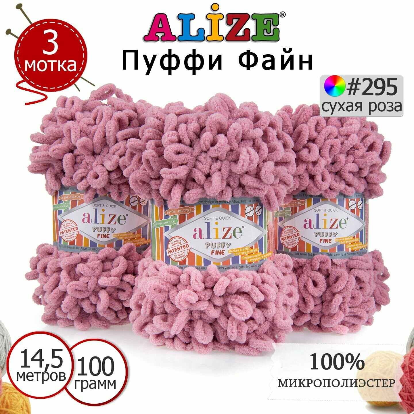 Пряжа Alize Puffy fine пыльная роза (295), 100%микрополиэстер, 14.5м, 100г, 3шт информация:
