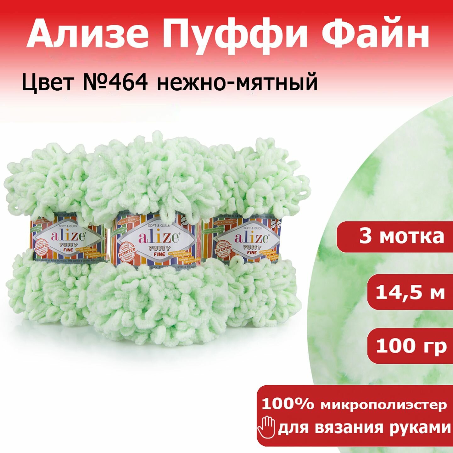Пряжа Alize Puffy fine мята (464), 100%микрополиэстер, 14.5м, 100г, 3шт информация: